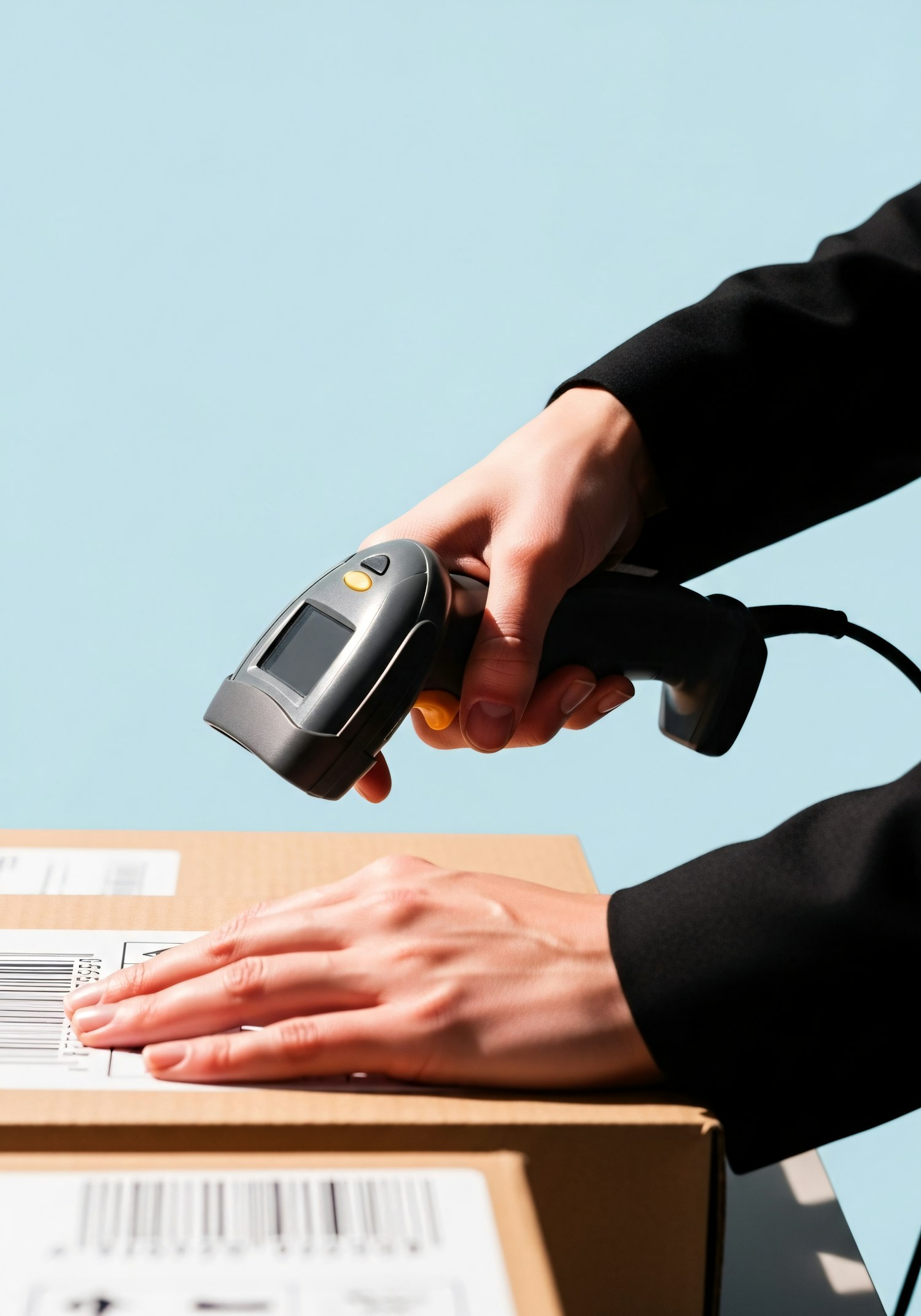 Close-up of a person scanning a barcode on a package with a handheld scanner, set against a clean light blue background.