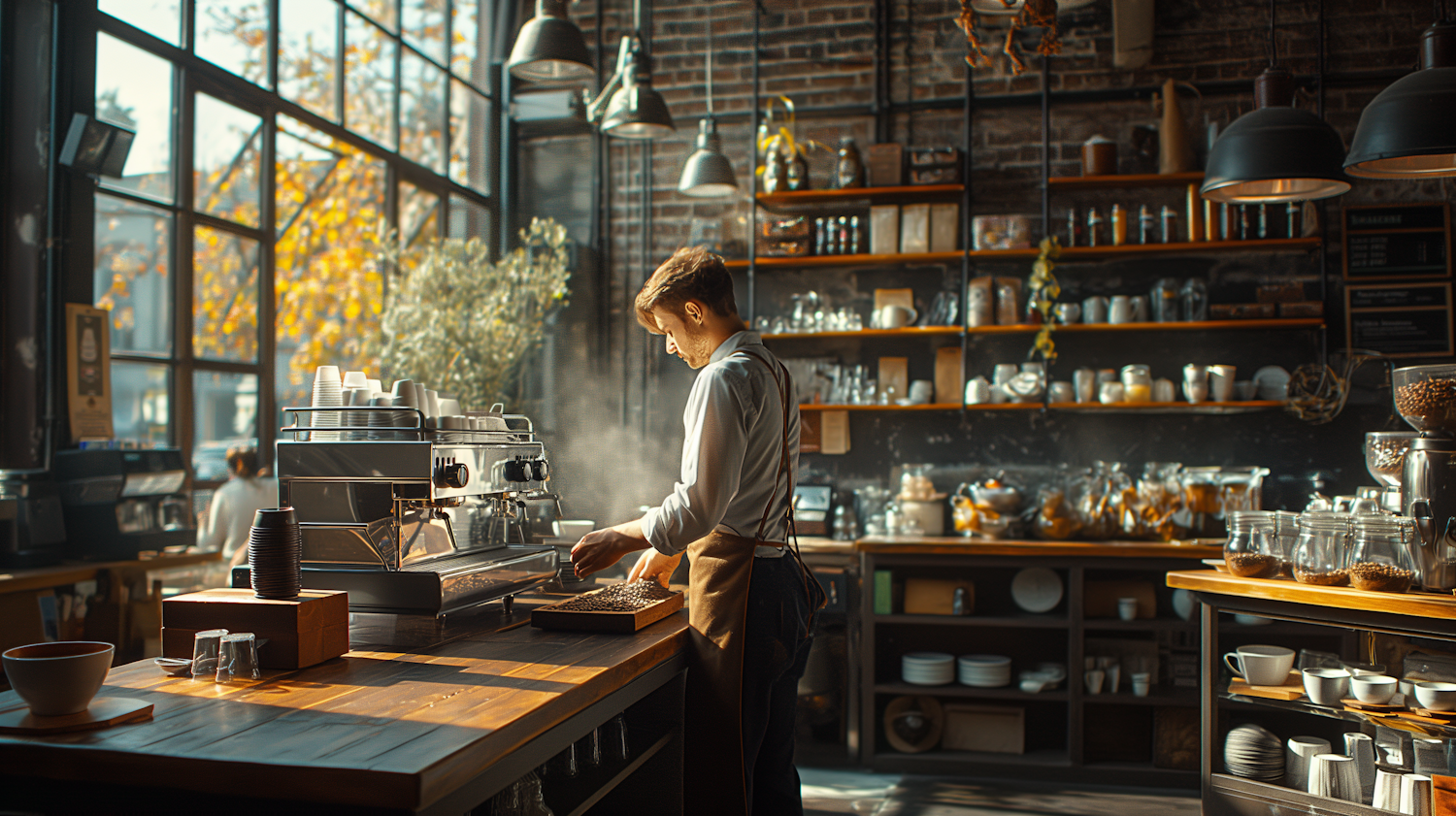 Barista in a cozy coffee shop prepares coffee, surrounded by warm sunlight and rustic decor, creating a welcoming atmosphere.