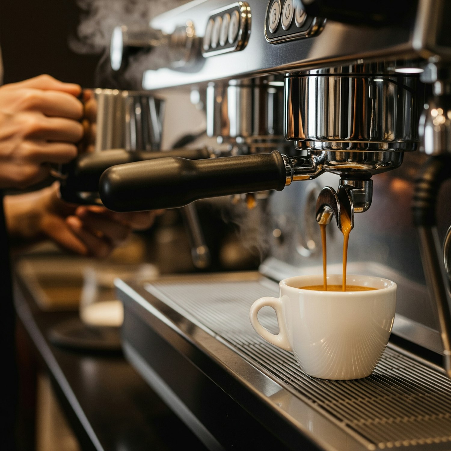 Close-up of a barista preparing espresso with a professional machine, showcasing the rich coffee pouring into a white cup.