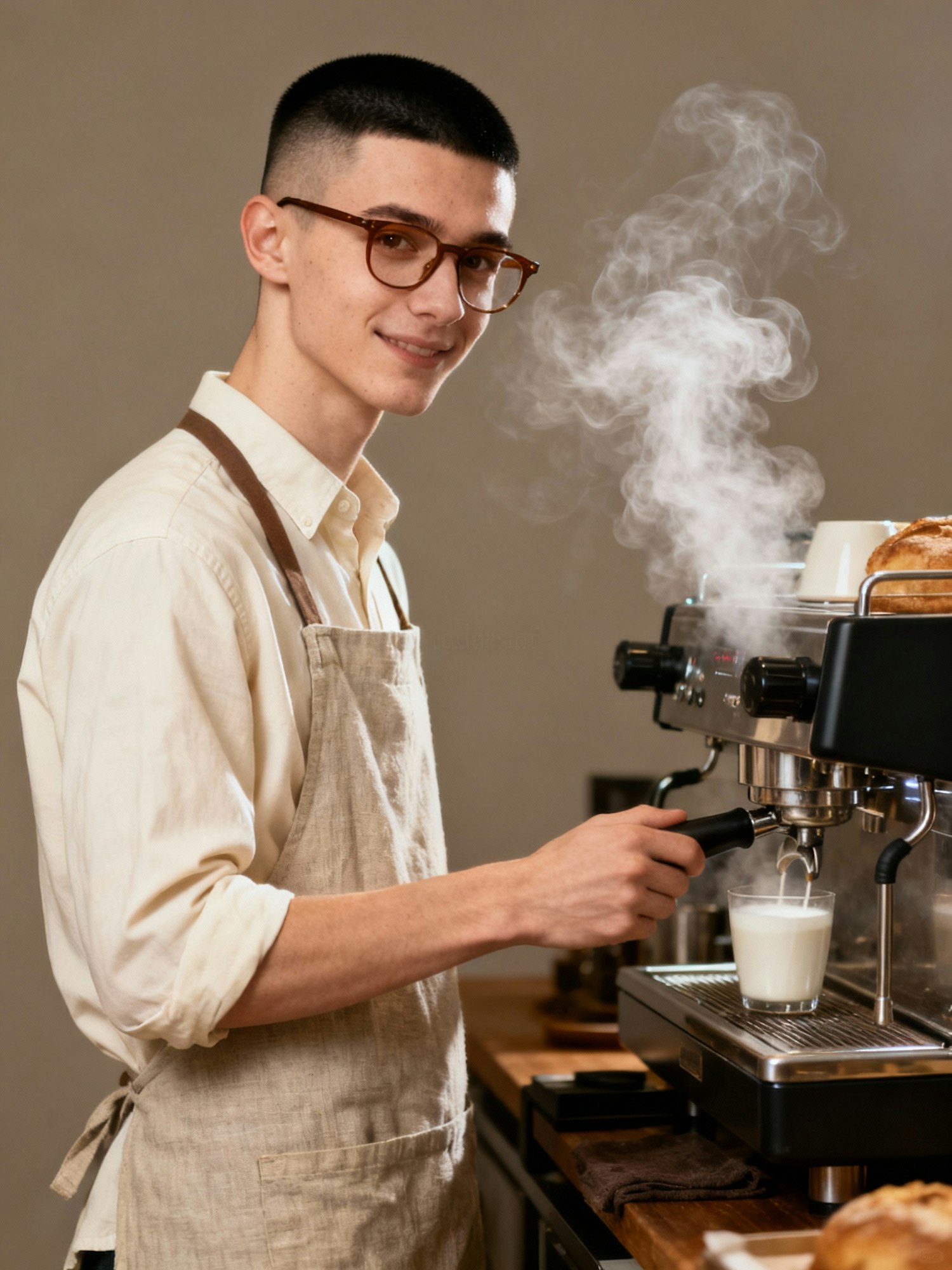 Studio portrait of a young man bakery owner in his mid-twenties with light neutral skin, black undercut, glasses, brown eyes; linen apron over a cream shirt; steaming milk at the espresso machine for bakery drinks; neutral seamless backdrop; Rembrandt lighting; 105mm macro-sharp detail; photorealistic, editorial. Expression: friendly concentration. Negative: “youthifying” skin blur, exaggerated smoothing, brand logos, watermark.