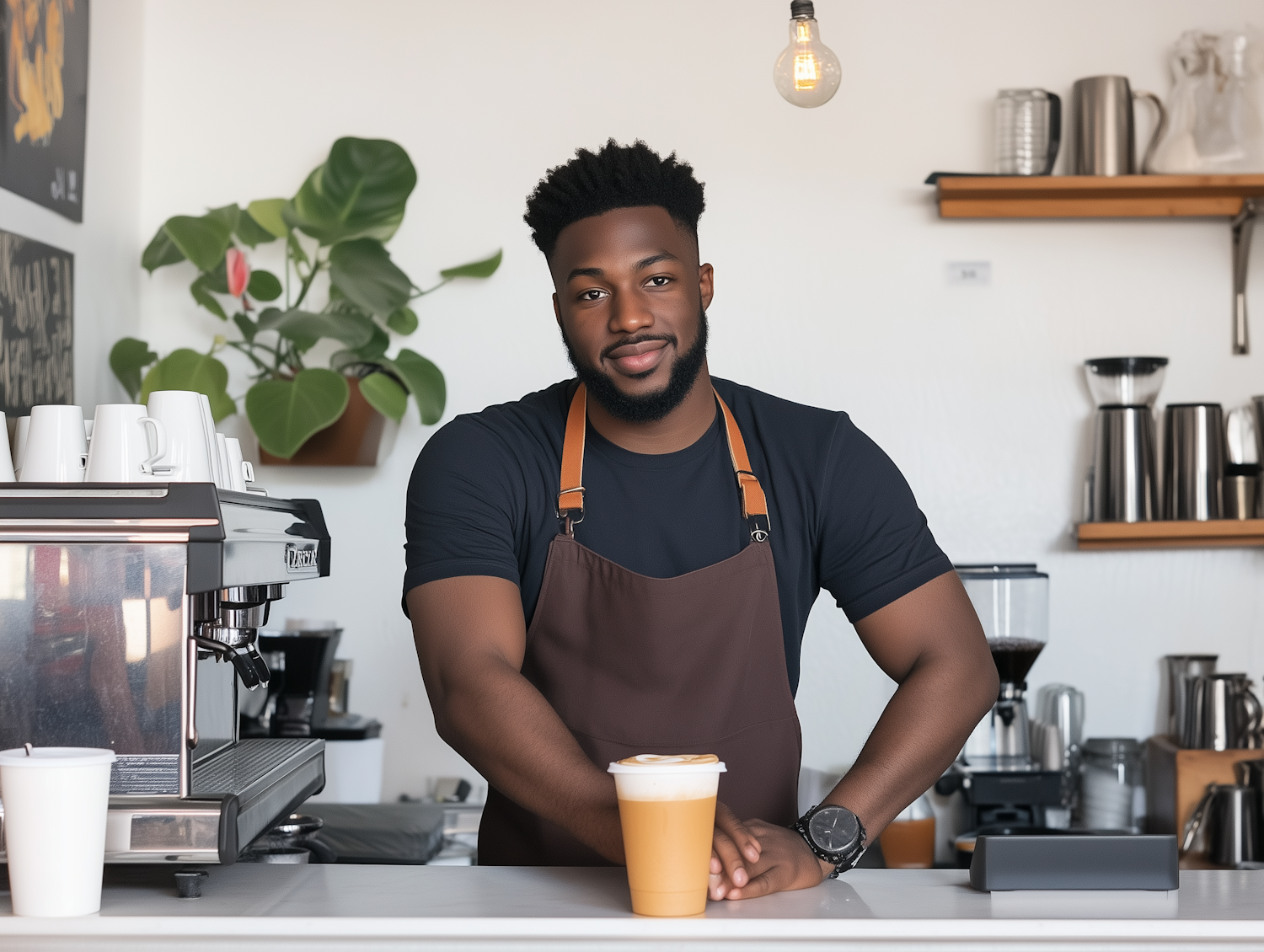 Barista in a cozy café with a latte, wearing a brown apron and black t-shirt, standing by a coffee machine and plant.