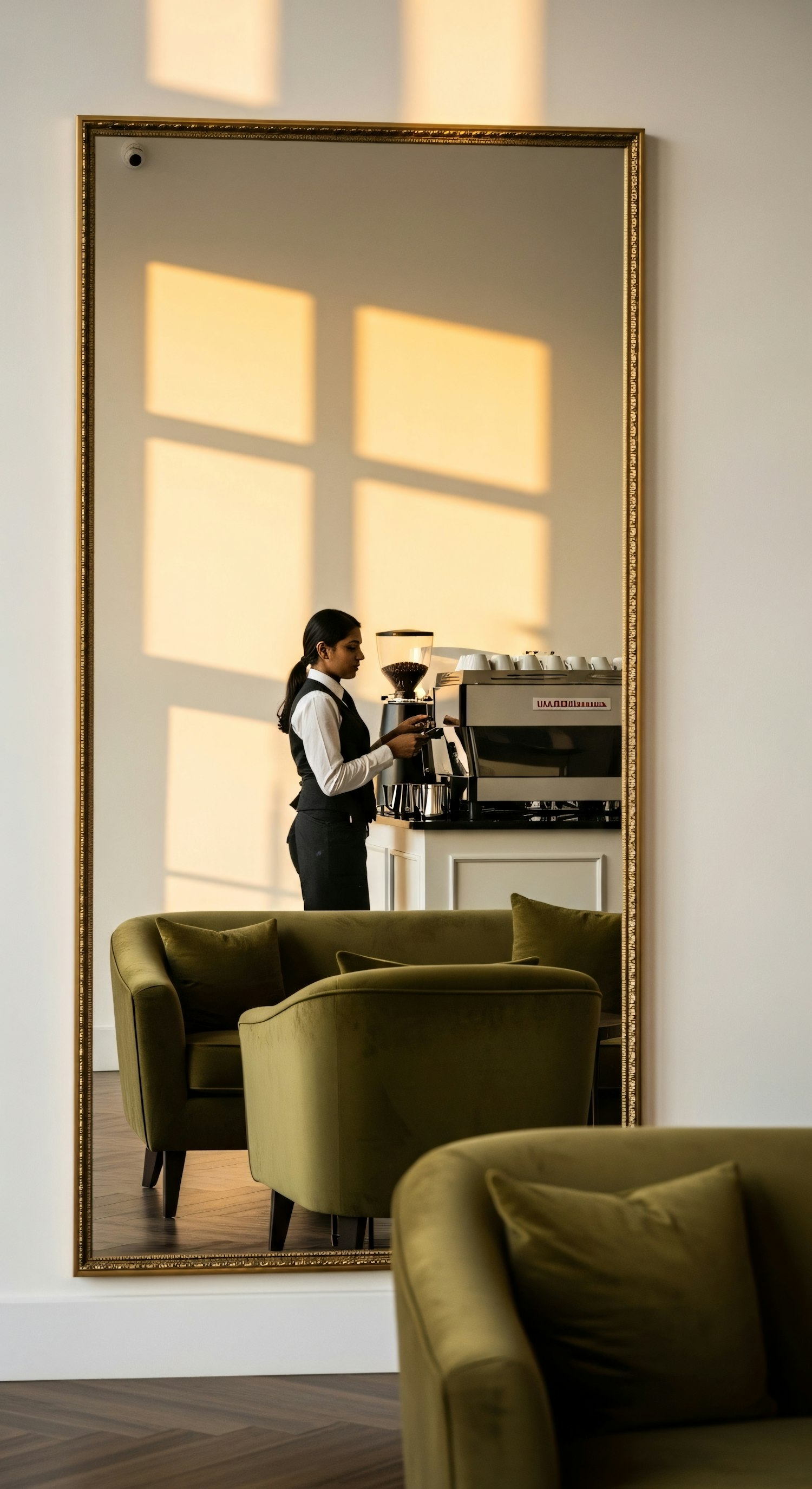 A barista prepares coffee in a stylish cafe, reflected in a gold-framed mirror with green velvet chairs and warm sunlight patterns.