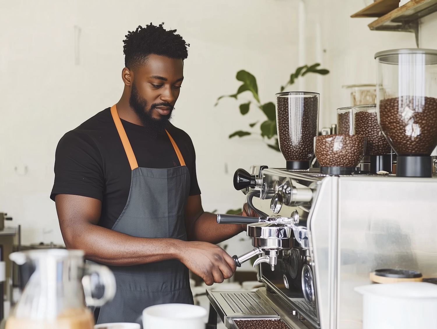 Barista with curly hair and beard making coffee using an espresso machine in a cozy cafe with coffee beans and cups on the counter.