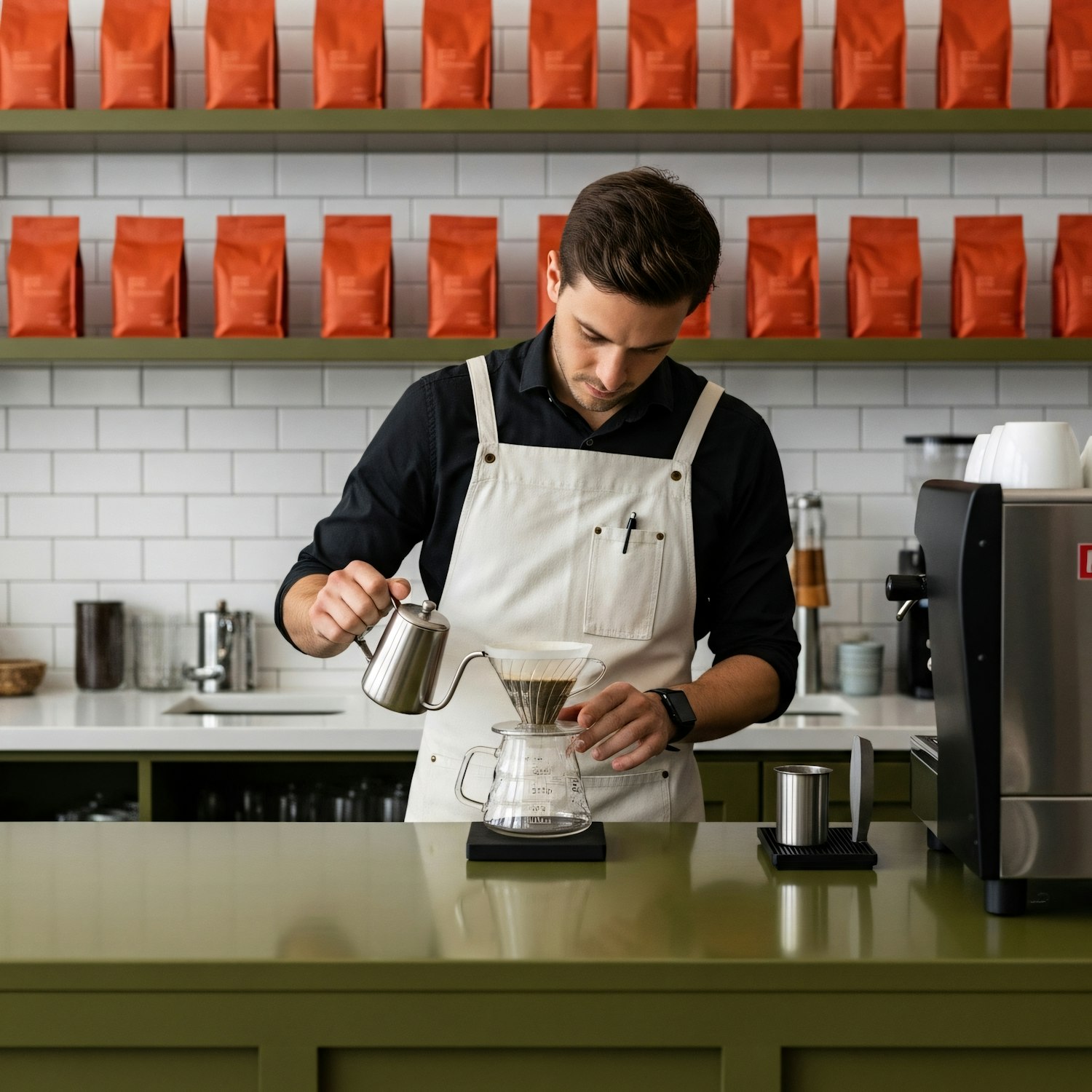 Barista preparing pour-over coffee in a modern café with orange coffee bags on shelves and a clean, stylish interior.