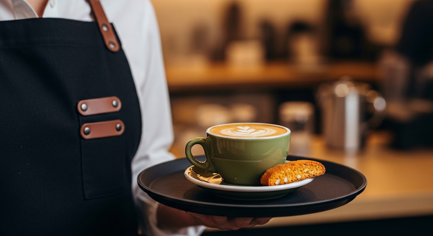 A barista serves a latte with beautiful art in a green cup, paired with a biscotti, on a black tray in a cozy café setting.