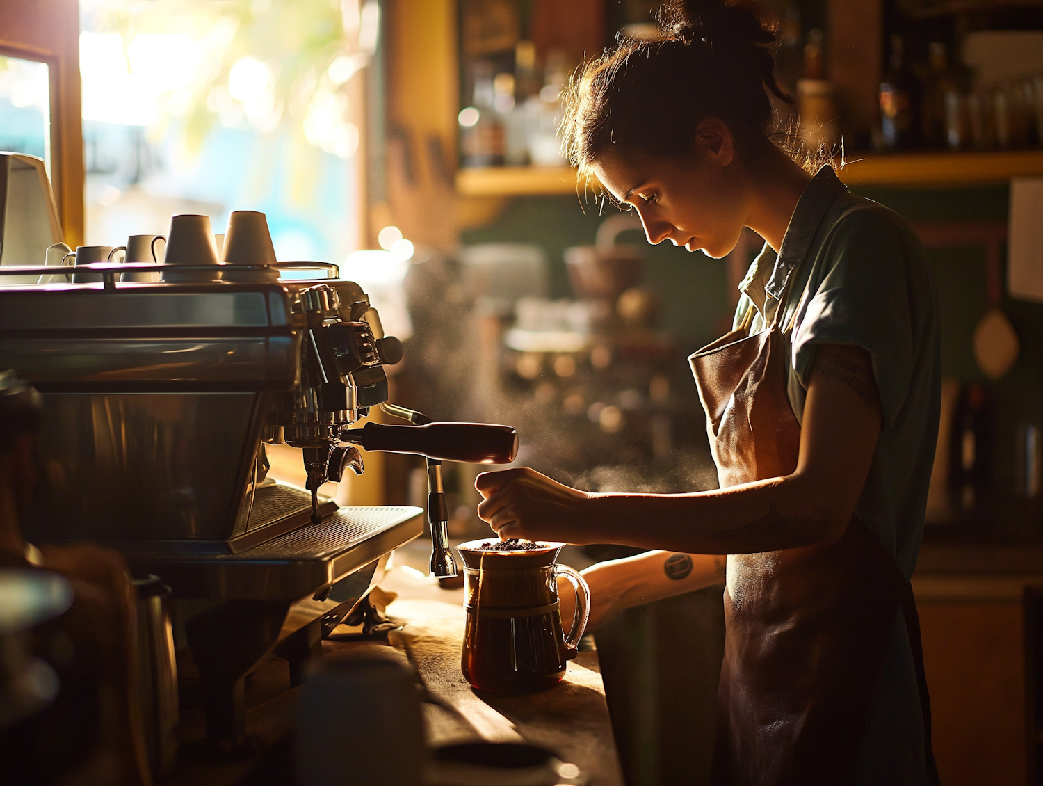 Barista making coffee in a sunlit café, focused and serene, with steam rising from the machine.
