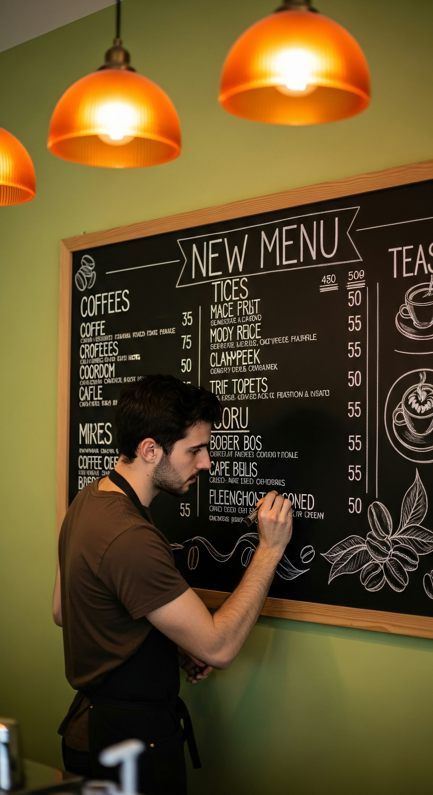 Barista updating a chalkboard menu in a cozy coffee shop with warm lighting and a green wall background.