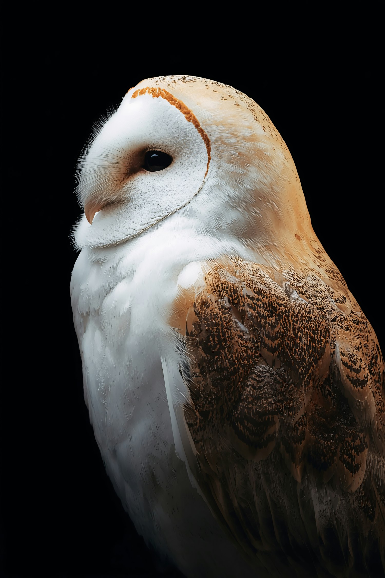 A stunning close-up of a barn owl with intricate feather details and a black background, highlighting its natural beauty.