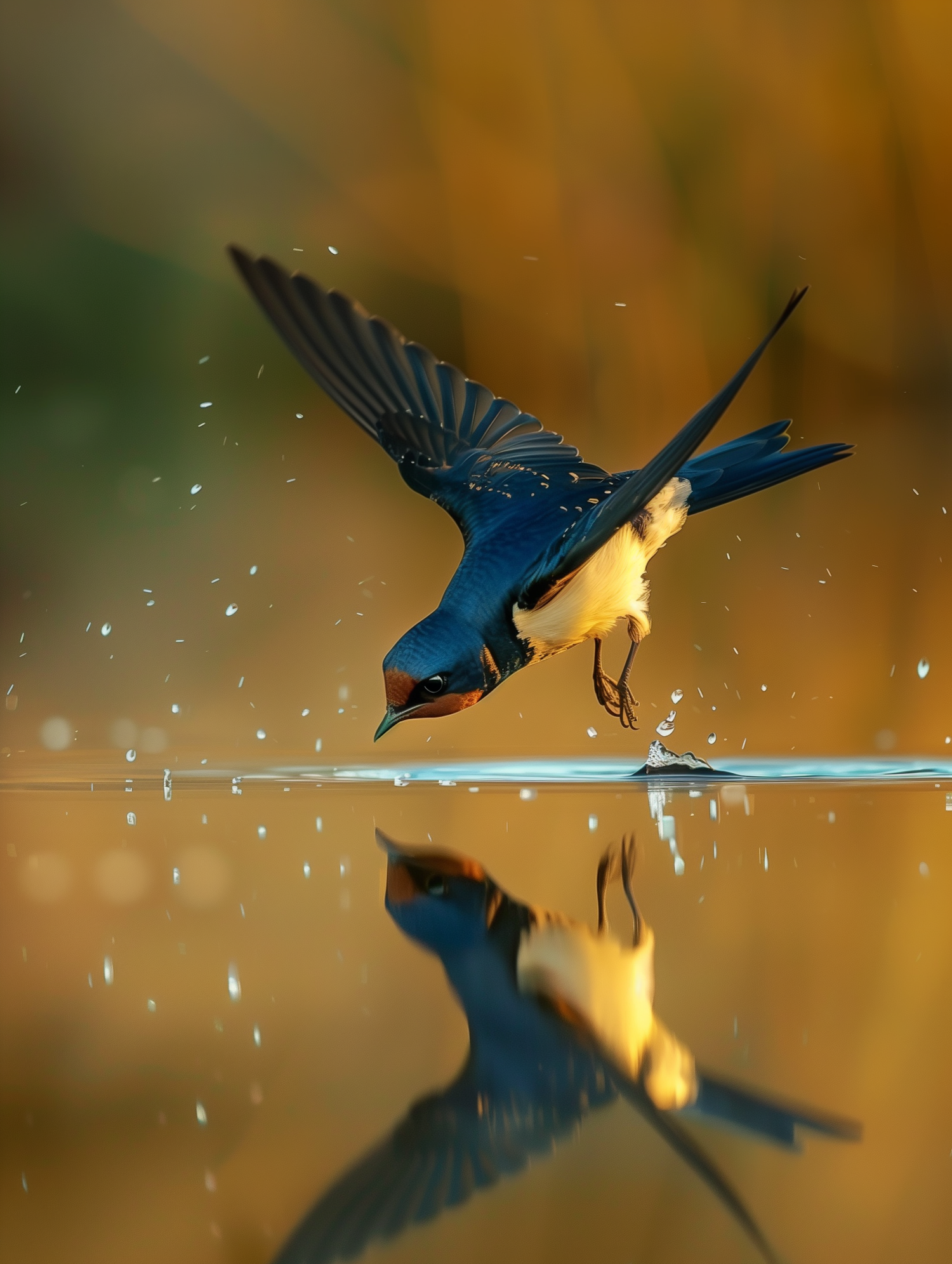 A swallow skims water with wings spread wide, creating a dynamic reflection against a warm, golden backdrop.