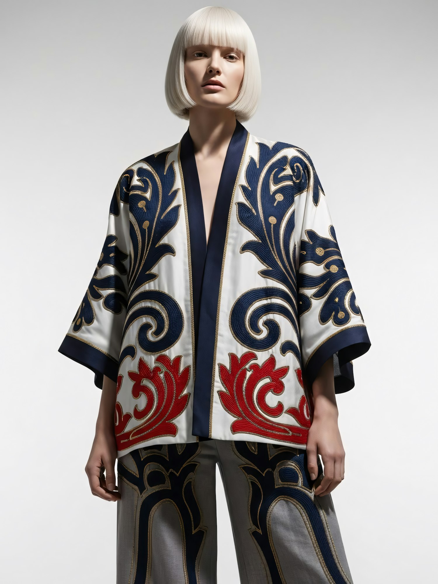A person in a bold, patterned outfit with intricate designs in navy, red, and gold, standing against a neutral background.