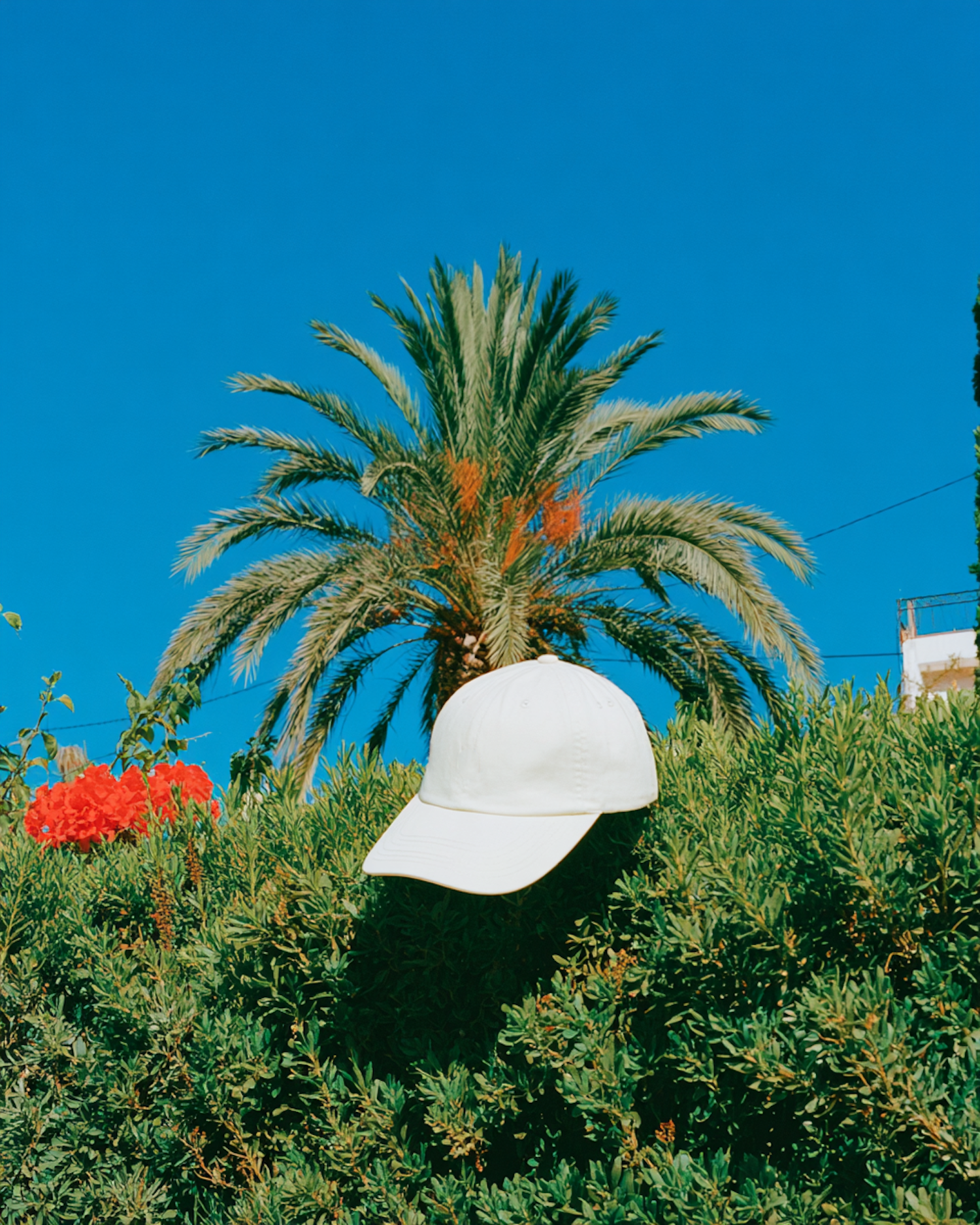 A white cap resting on a green bush with a palm tree and bright blue sky in the background, creating a vibrant and sunny outdoor scene.