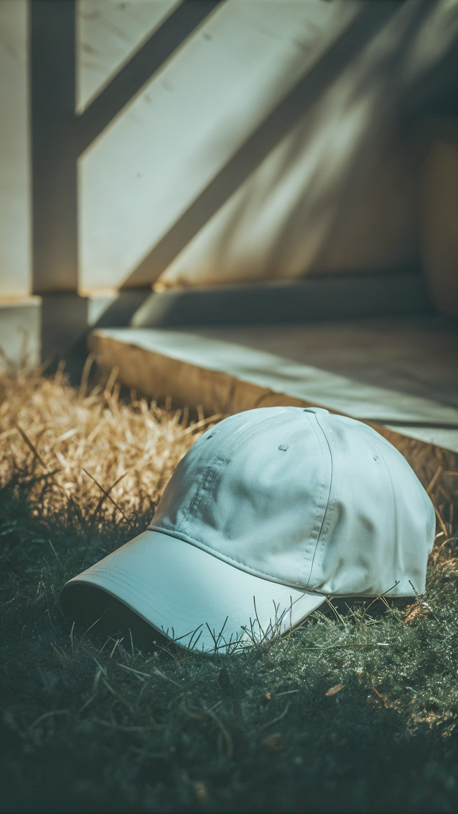A light-colored baseball cap on grass, illuminated by sunlight, with shadows from a nearby structure creating a serene outdoor scene.