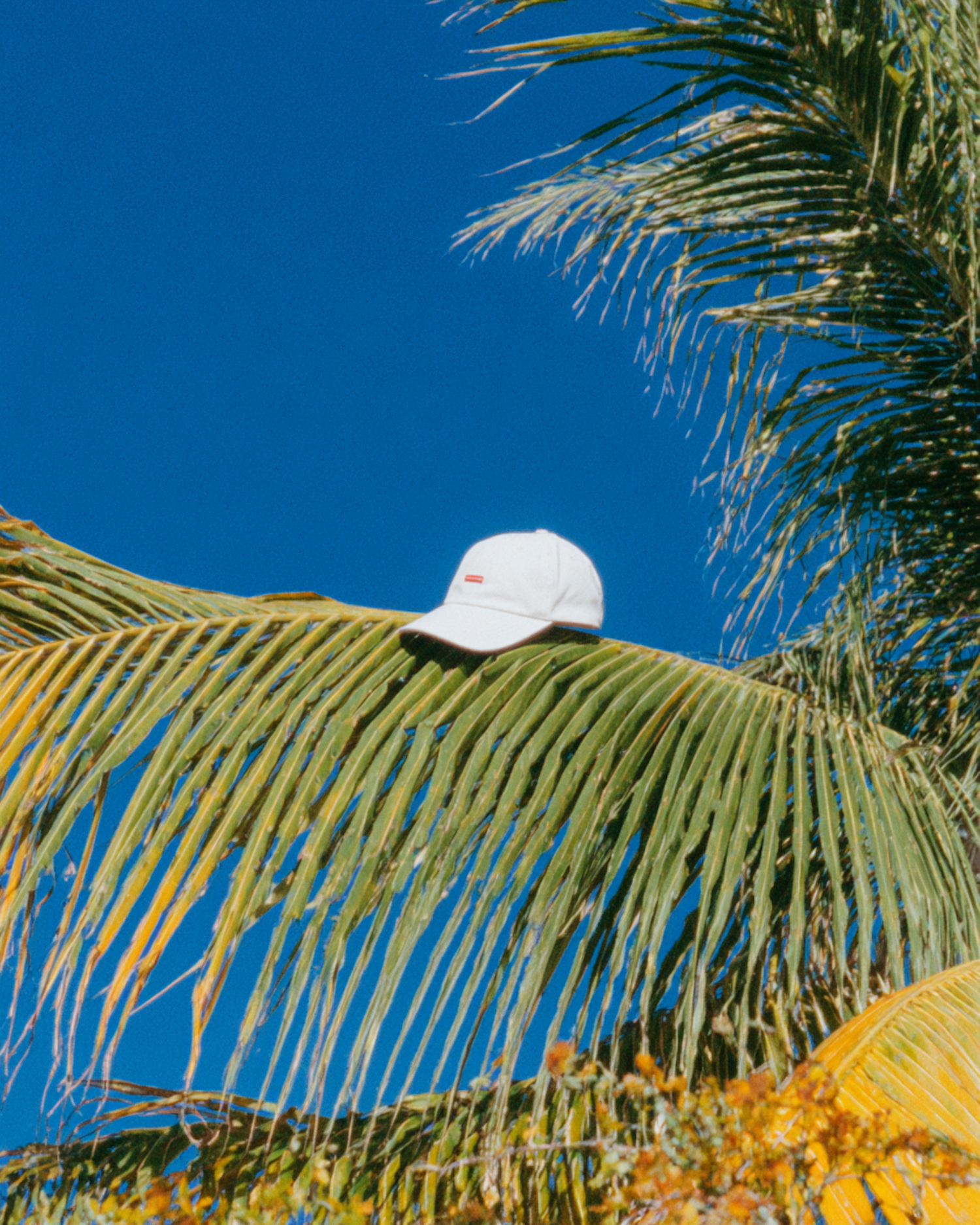 A white cap with a red logo sits on a palm frond against a vibrant blue sky, creating a tropical and minimalist aesthetic.