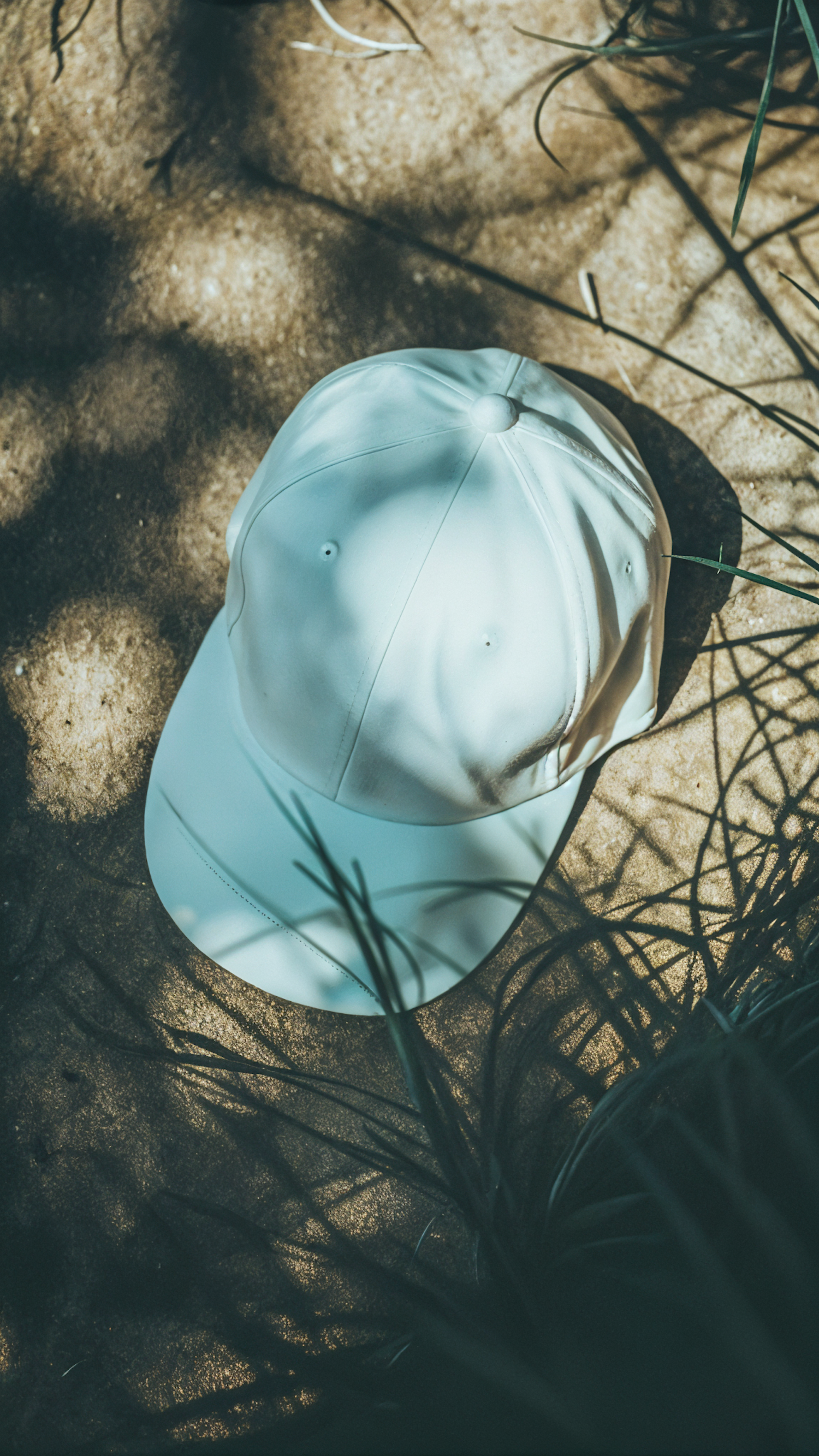 White baseball cap on sandy ground with grass shadows, creating a serene and natural scene with light and shadow interplay.
