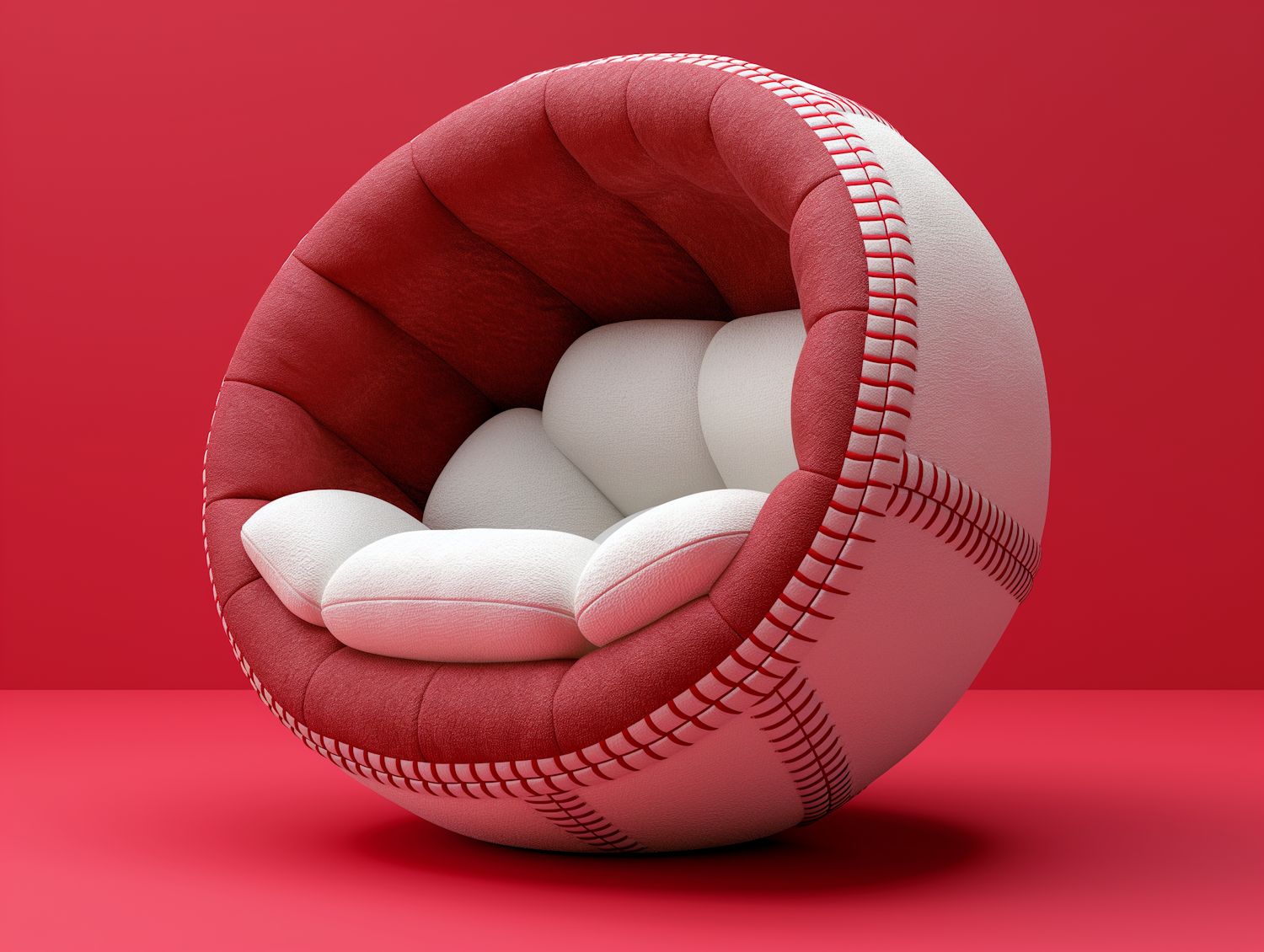 Baseball-inspired spherical chair with red and white cushioned design, perfect for sports fans and modern interiors.