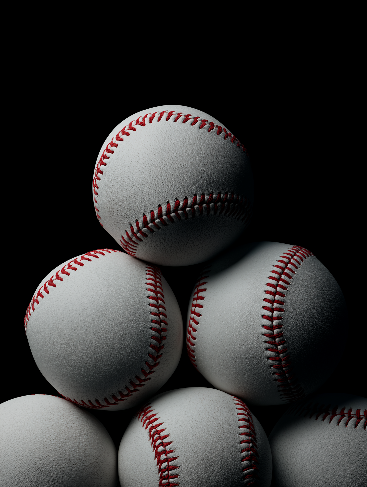 A dramatic arrangement of white baseballs with red stitching against a black background, showcasing their texture and iconic design.