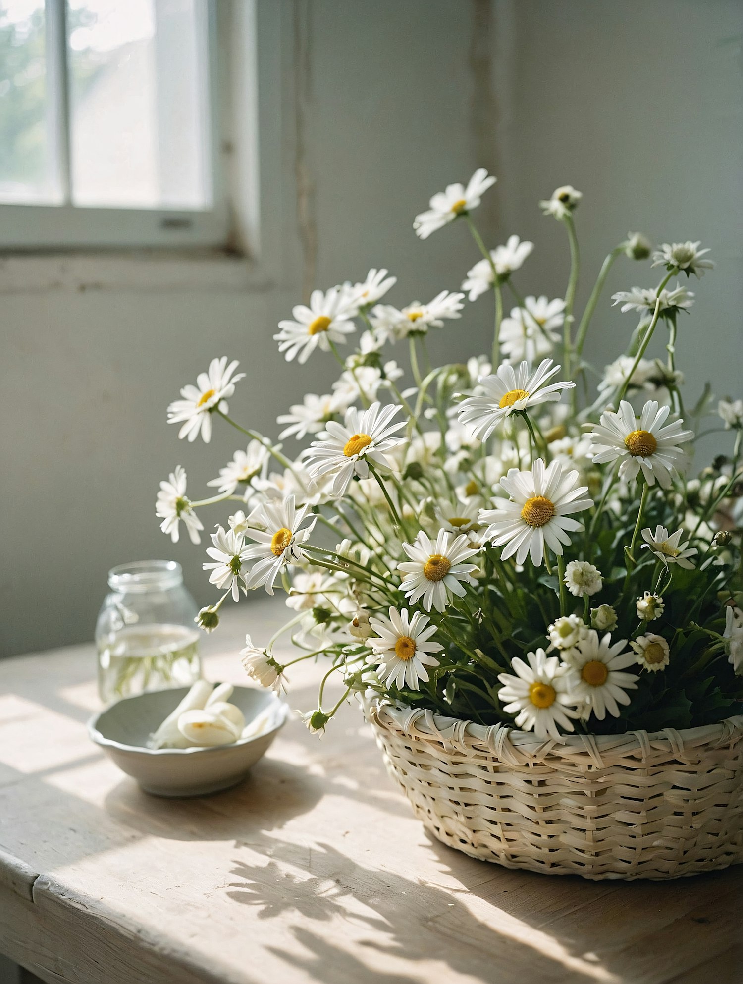 A wicker basket of daisies on a sunlit table with a jar and bowl, creating a serene, rustic atmosphere.