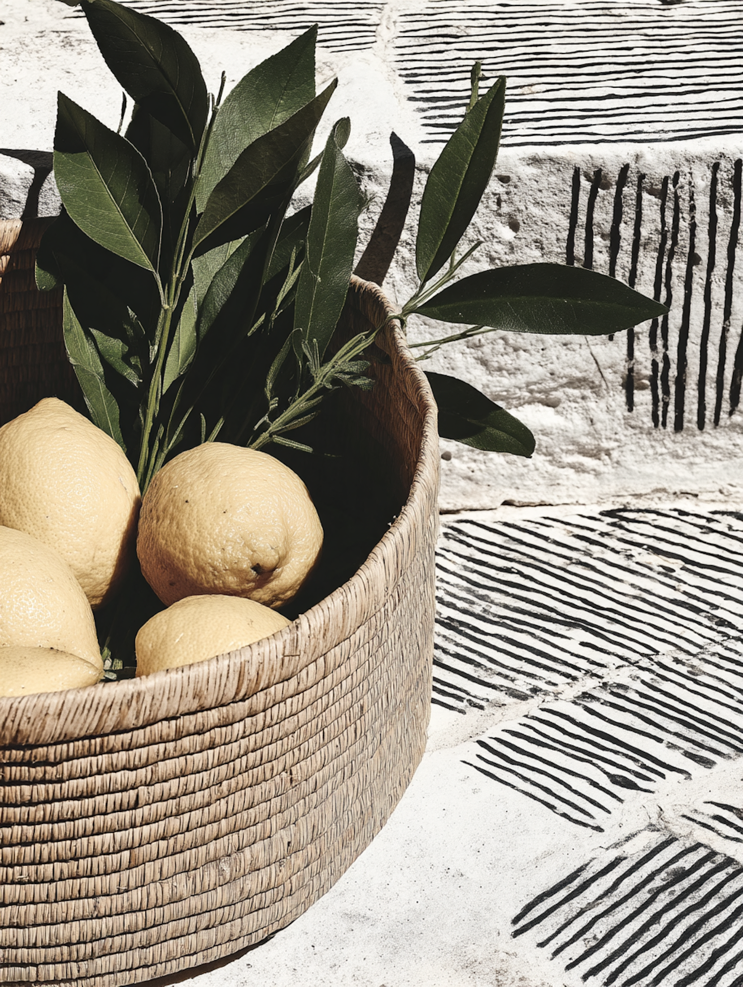A woven basket with fresh lemons and green leaves on a textured white surface with black linear patterns, bathed in natural light.