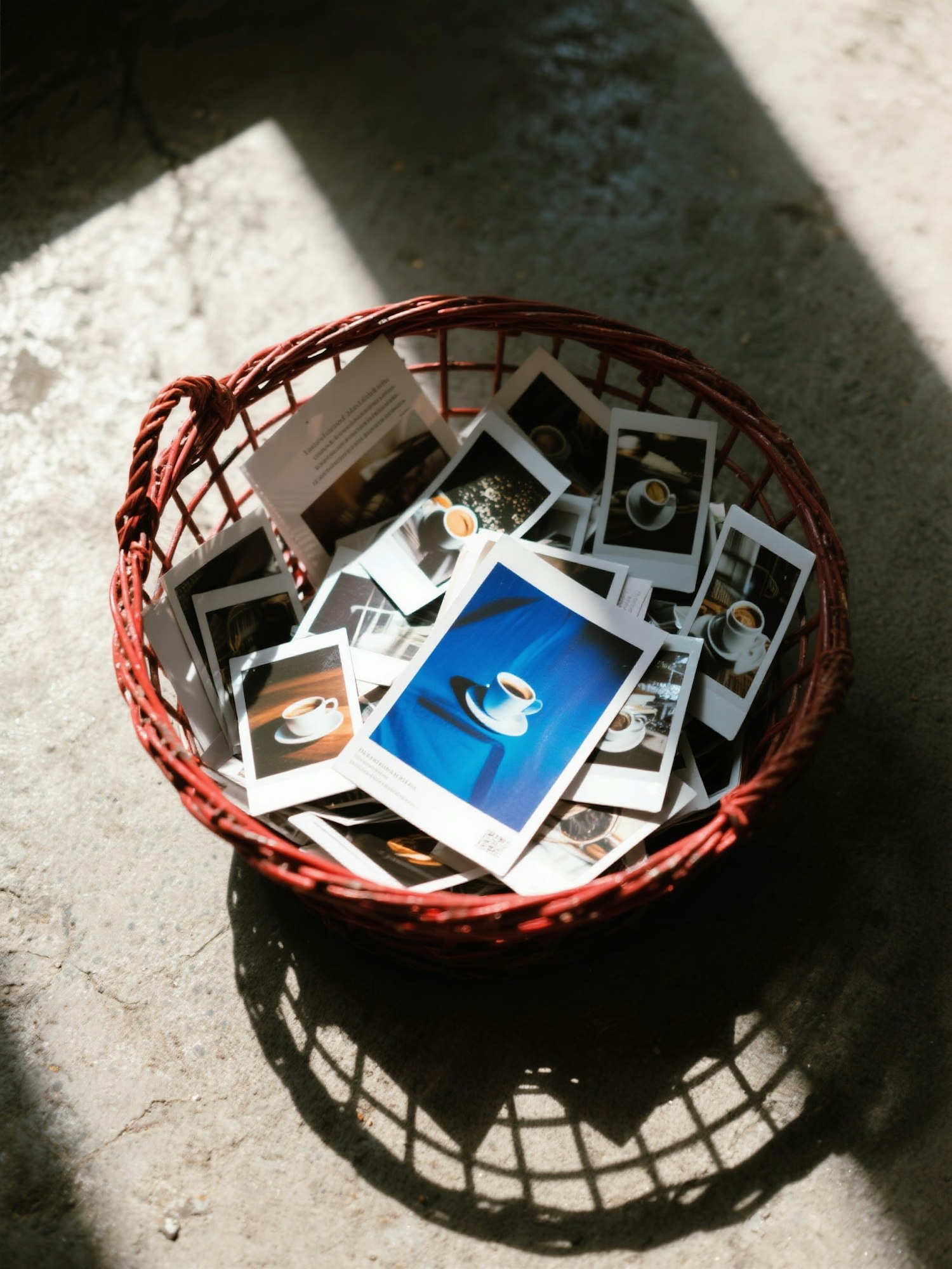 A red basket filled with printed photographs, including a coffee cup on a blue background, illuminated by sunlight on a concrete floor.
