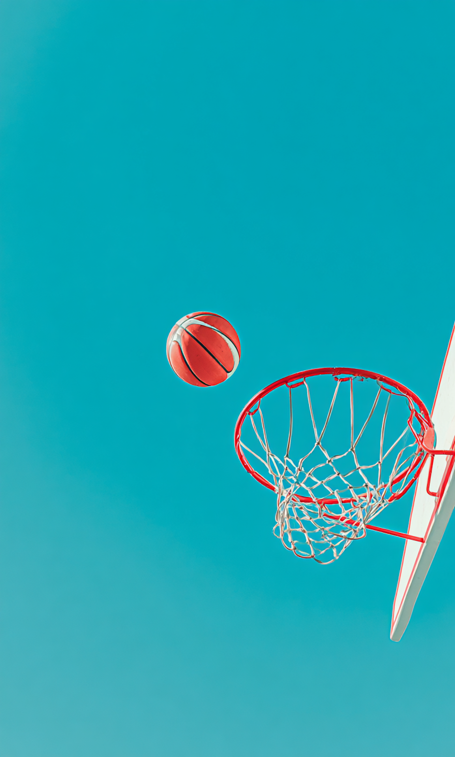 A basketball in motion toward a hoop against a vivid blue sky. Simple, clear, and dynamic with vibrant colors.