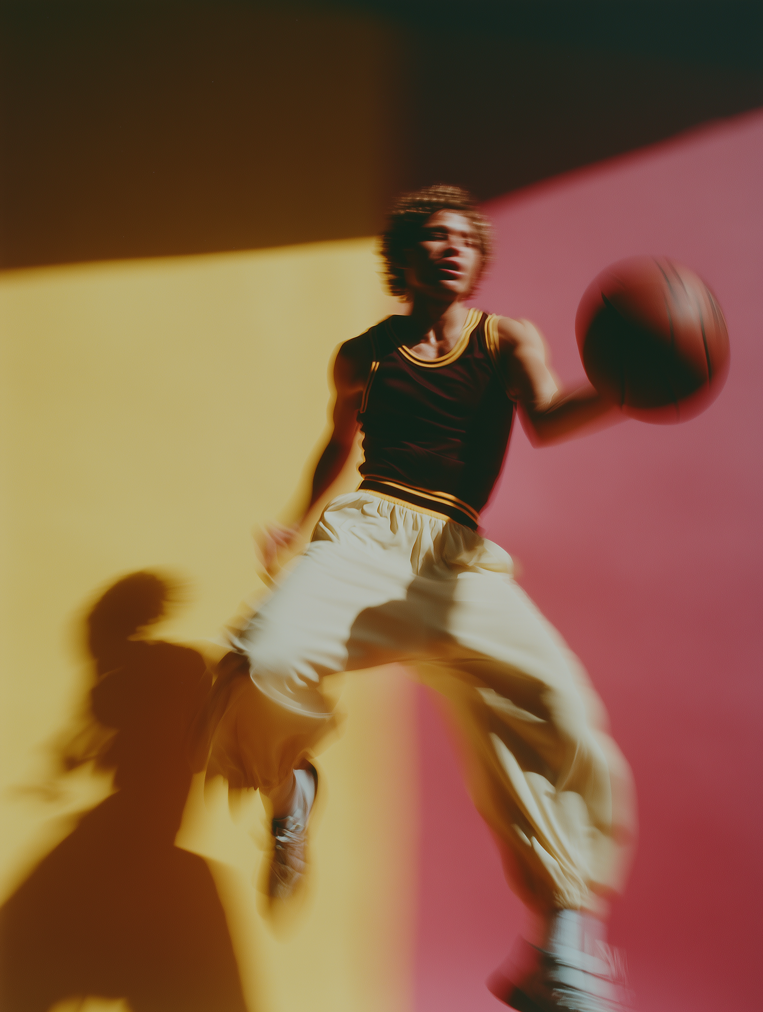 A basketball player in motion against a vibrant yellow and pink background, emphasizing energy and movement with a dynamic blurred effect.
