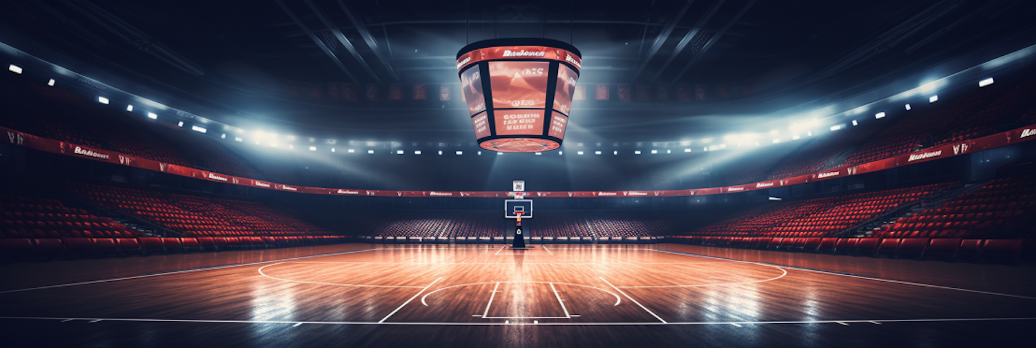 Empty basketball arena with bright lights, red seats, and a central scoreboard, creating a serene and anticipatory atmosphere.