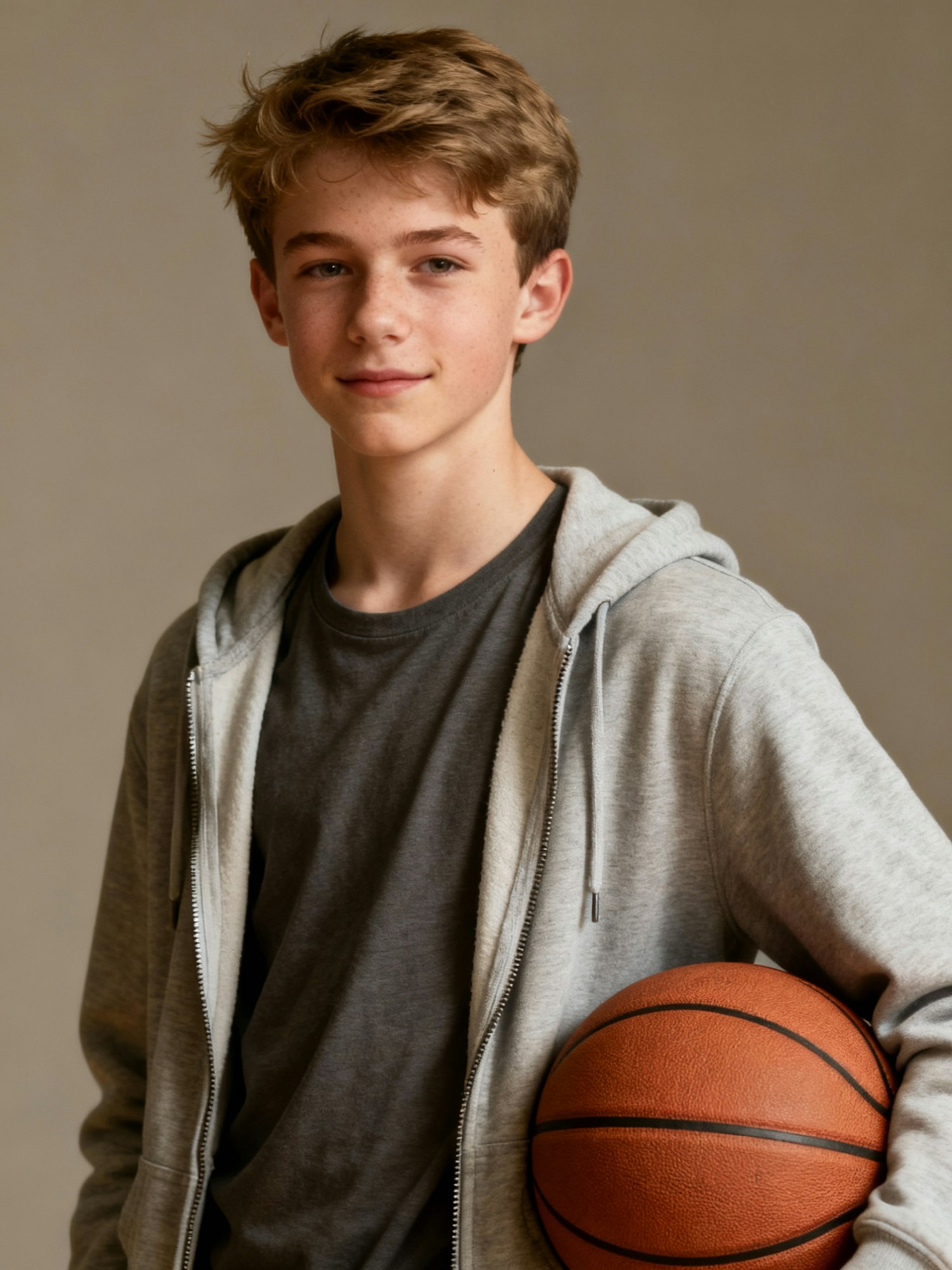 A young person with light brown hair and a gray hoodie holds a basketball, standing against a neutral background.