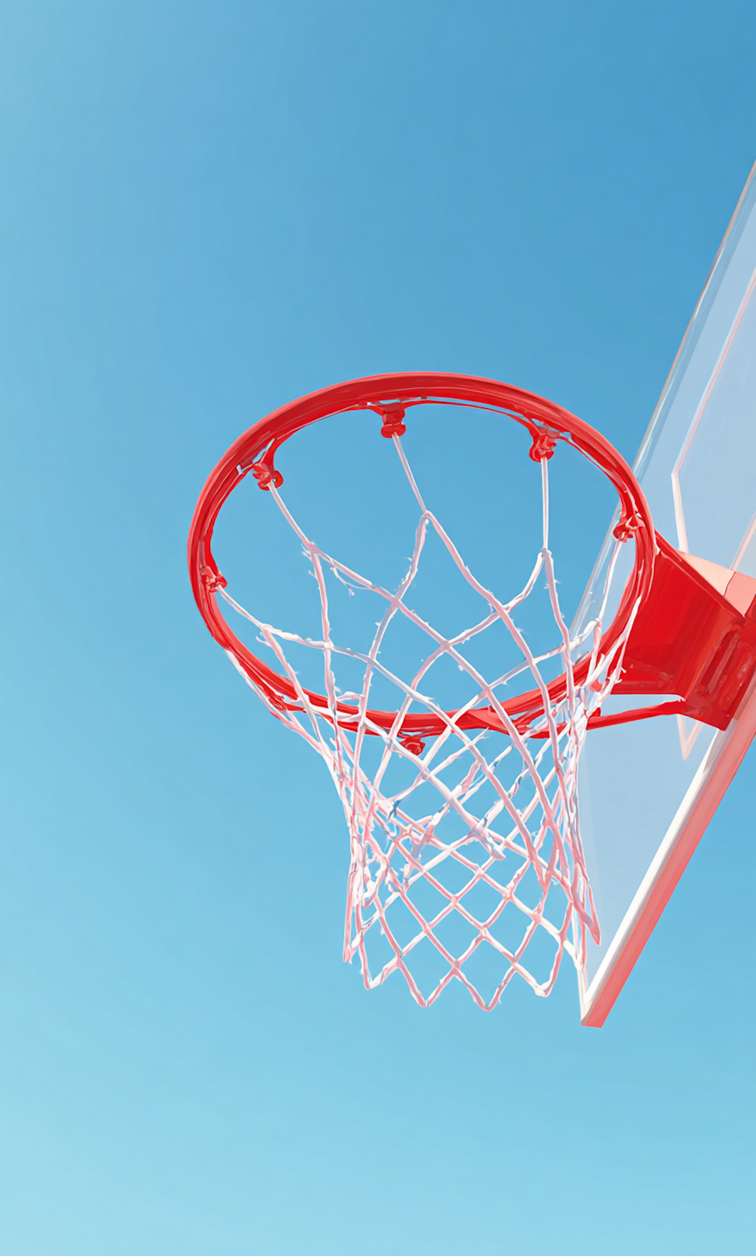 A basketball hoop against a clear sky creates a bold, vibrant shot, perfect for sports enthusiasts or outdoor scenes.
