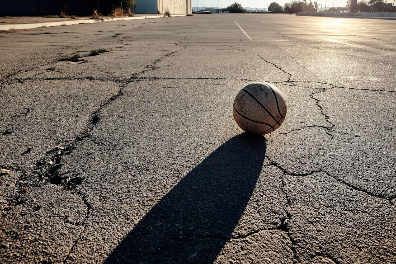 A lone basketball on cracked asphalt, bathed in golden sunset light, creating a nostalgic and dramatic urban scene.