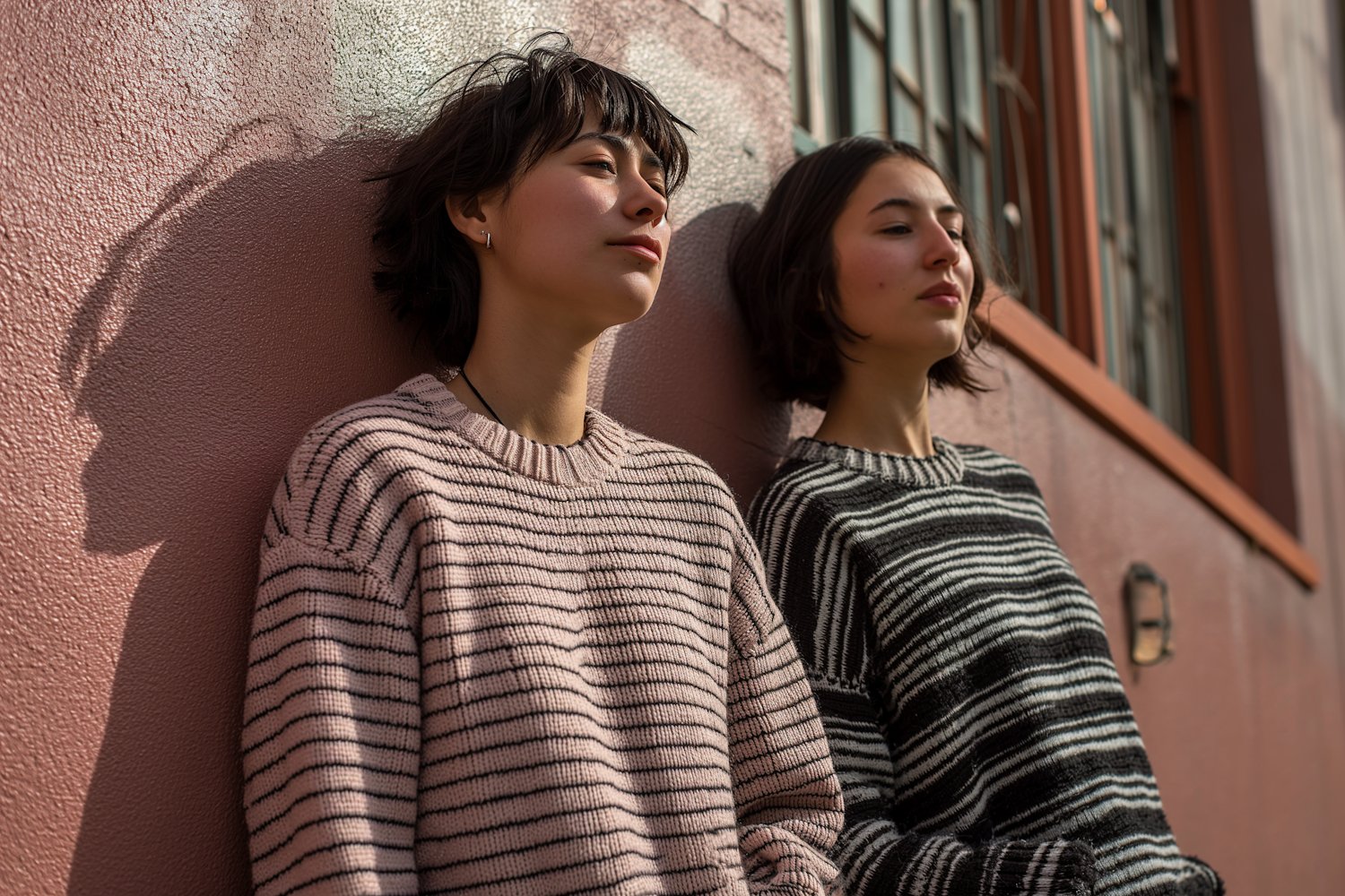 Two women in striped sweaters lean against a pink wall, enjoying the sunlight. Their relaxed expressions and urban backdrop create a serene scene.