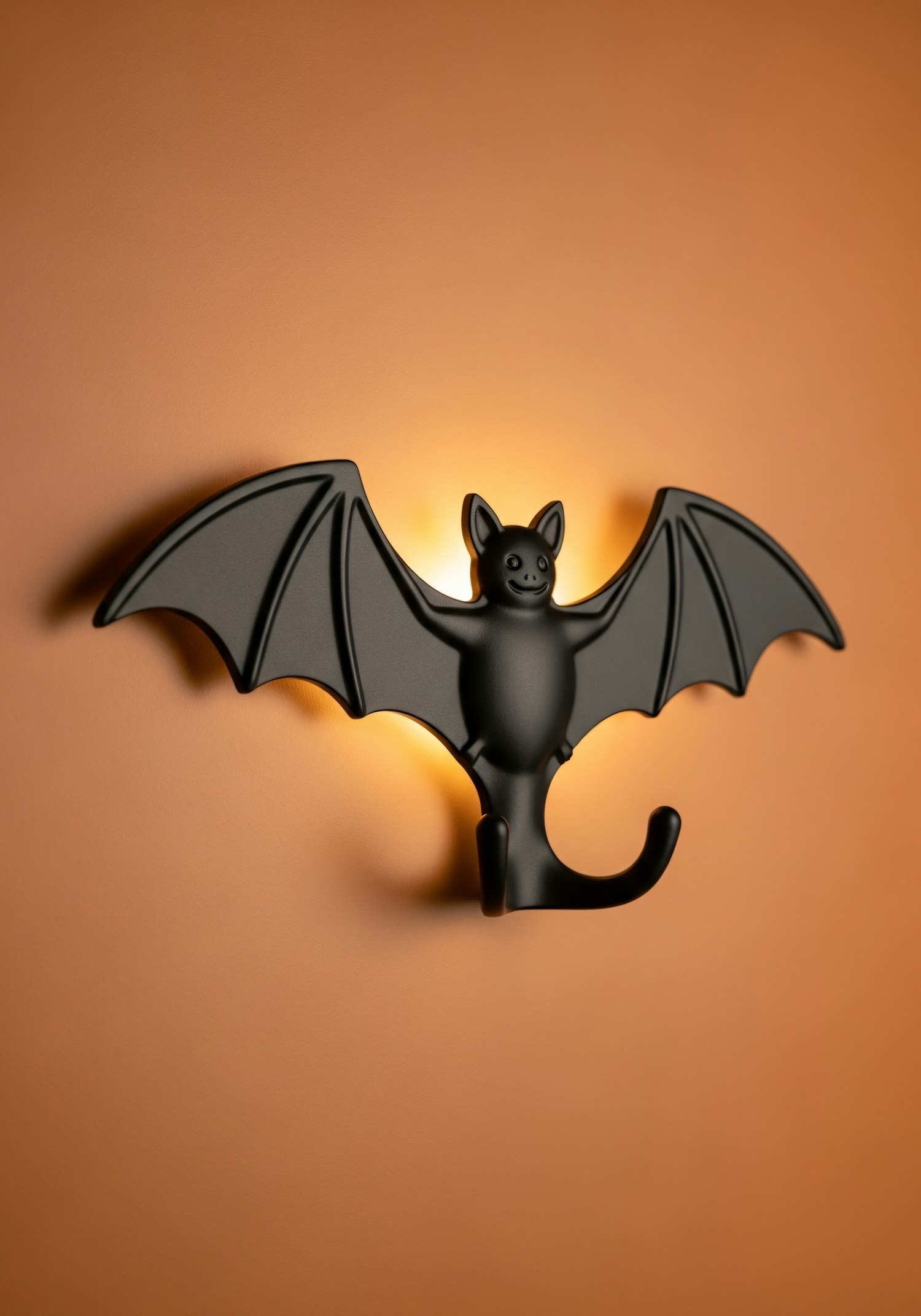 A black bat-shaped wall hook with glowing backlight on an orange wall, combining functionality with a playful and artistic design.