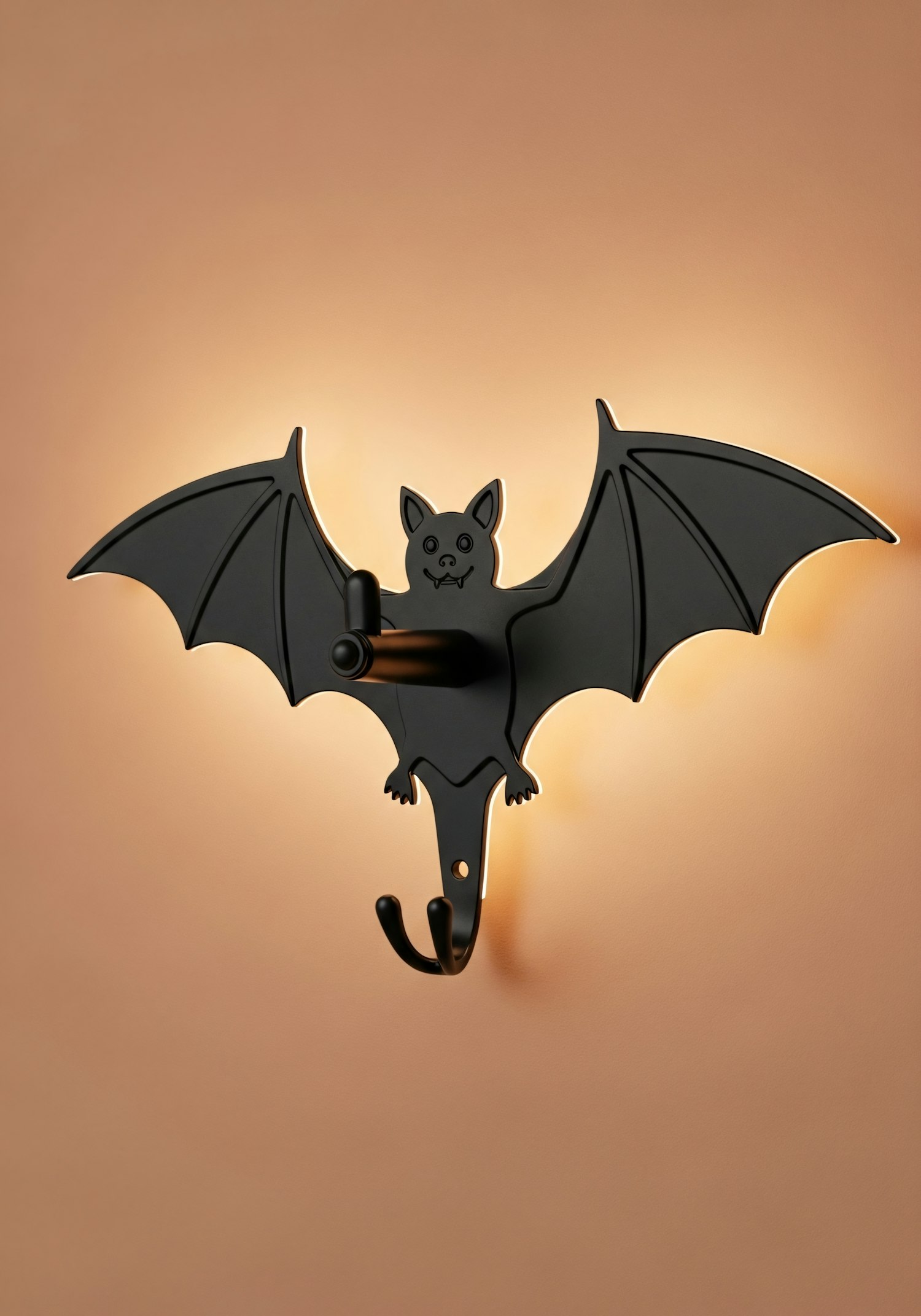 A black bat-shaped wall hook with glowing backlight on a beige wall, combining functionality with a playful design.