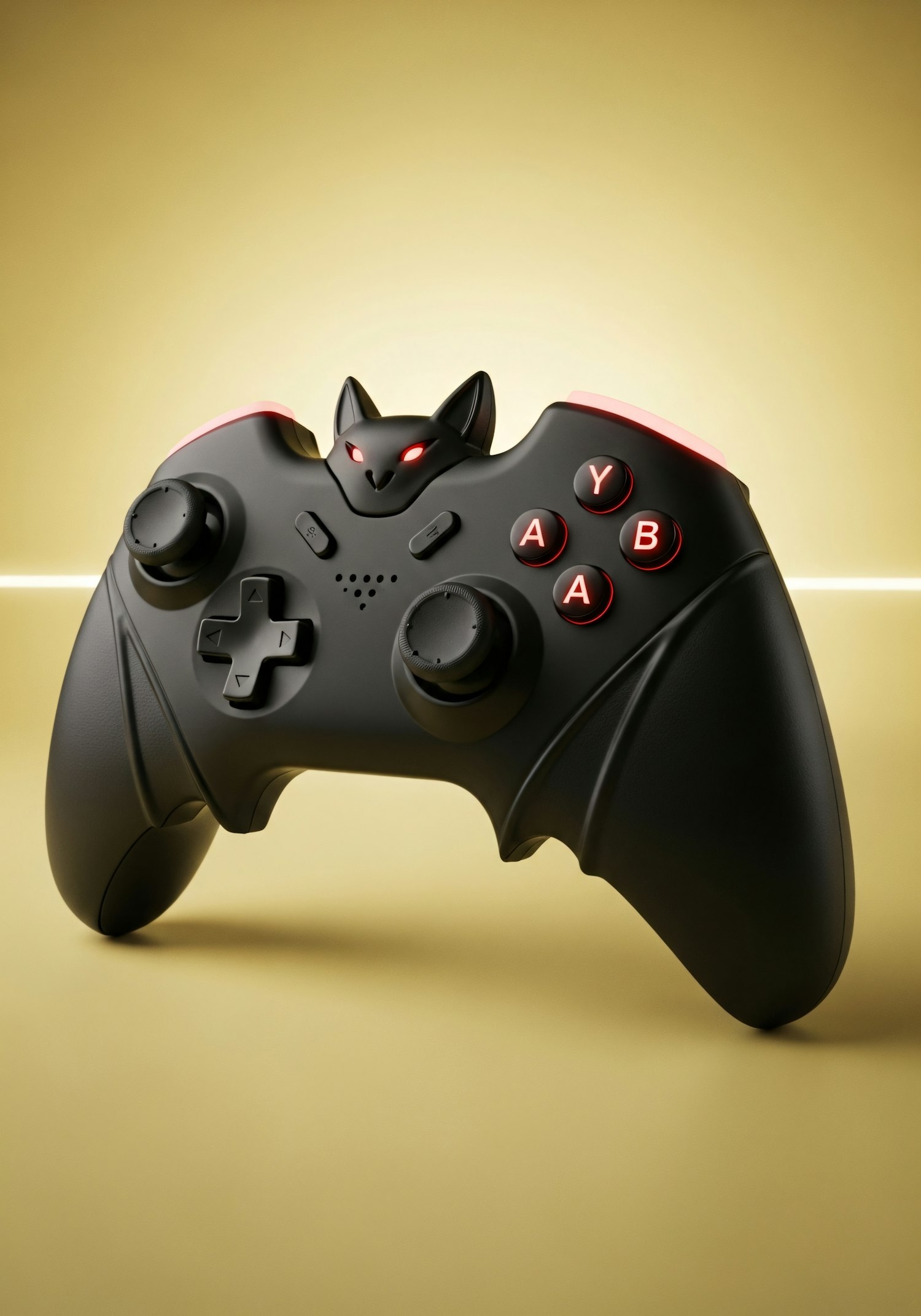 A stylish black gaming controller with bat-inspired design and glowing red accents, perfect for gamers seeking a unique aesthetic.