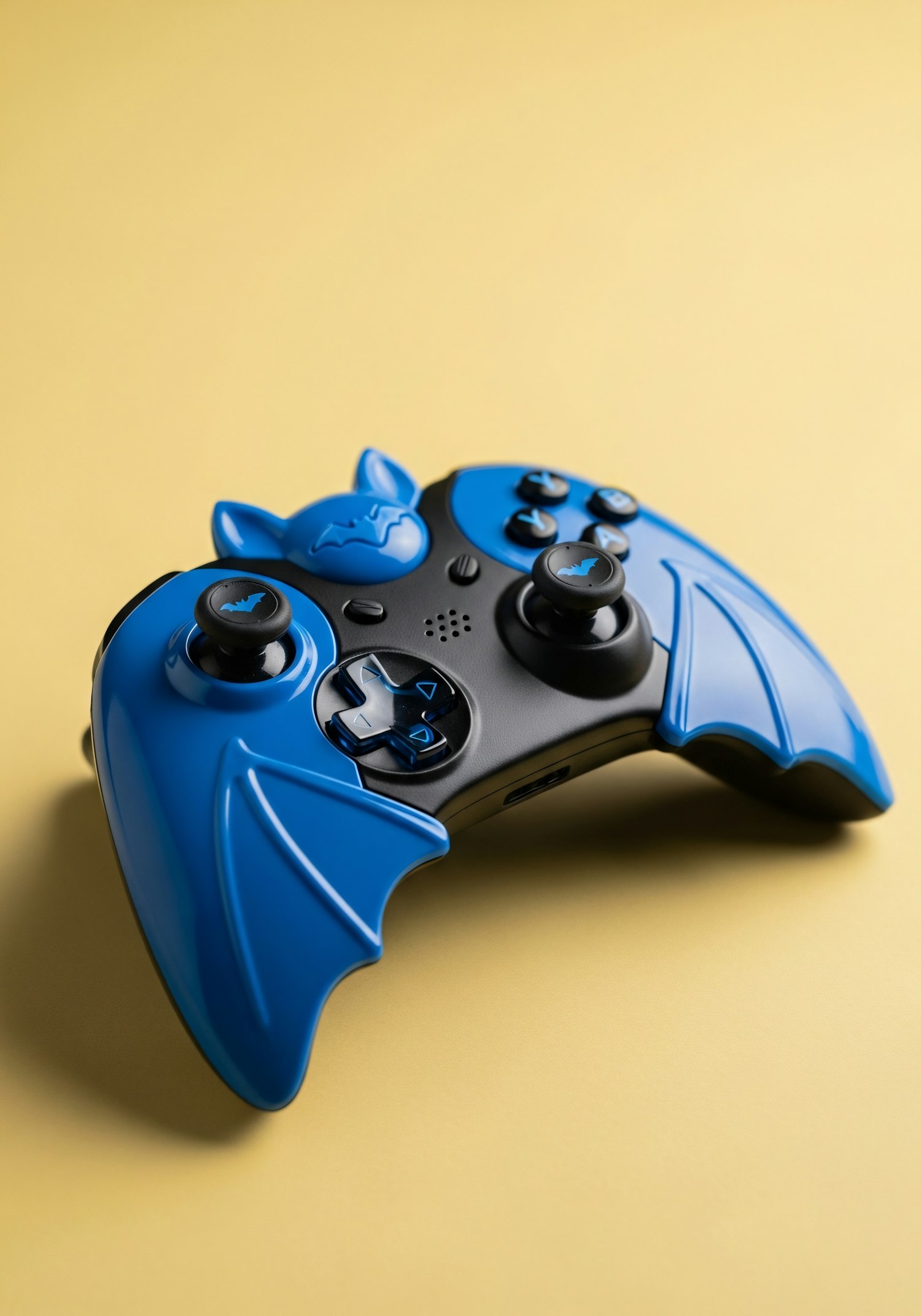 A stylish black and blue gaming controller with bat-inspired design, set against a vibrant yellow background.