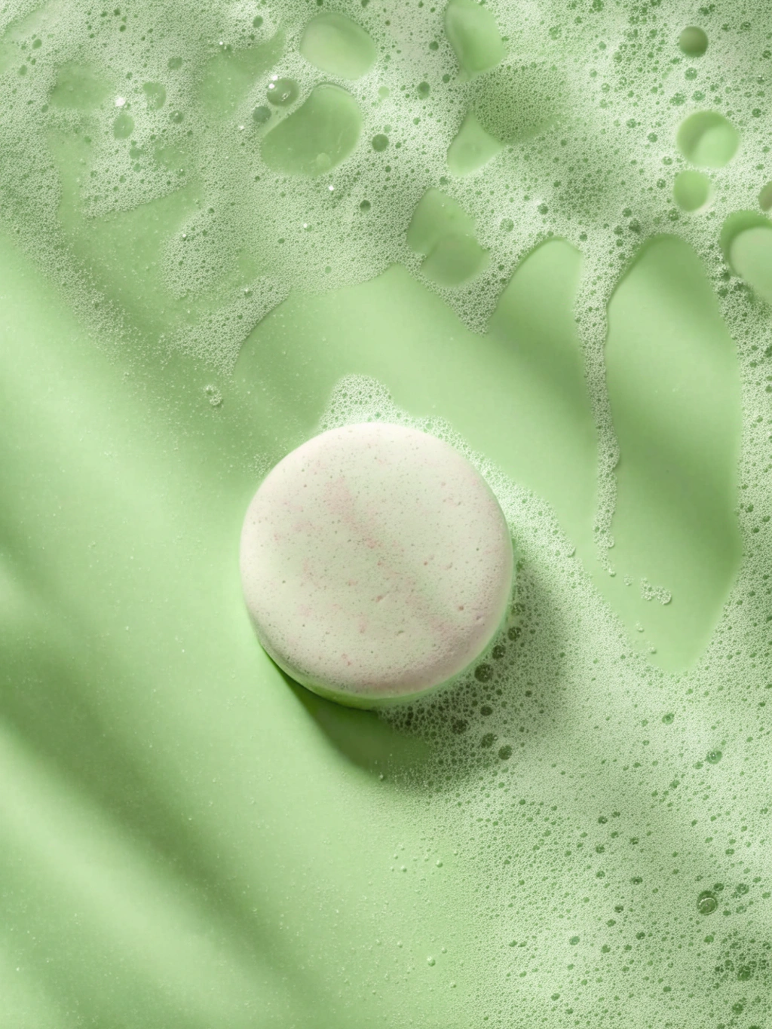 A pale bath bomb with pink speckles floats in frothy, light green water, creating a relaxing and spa-like vibe.