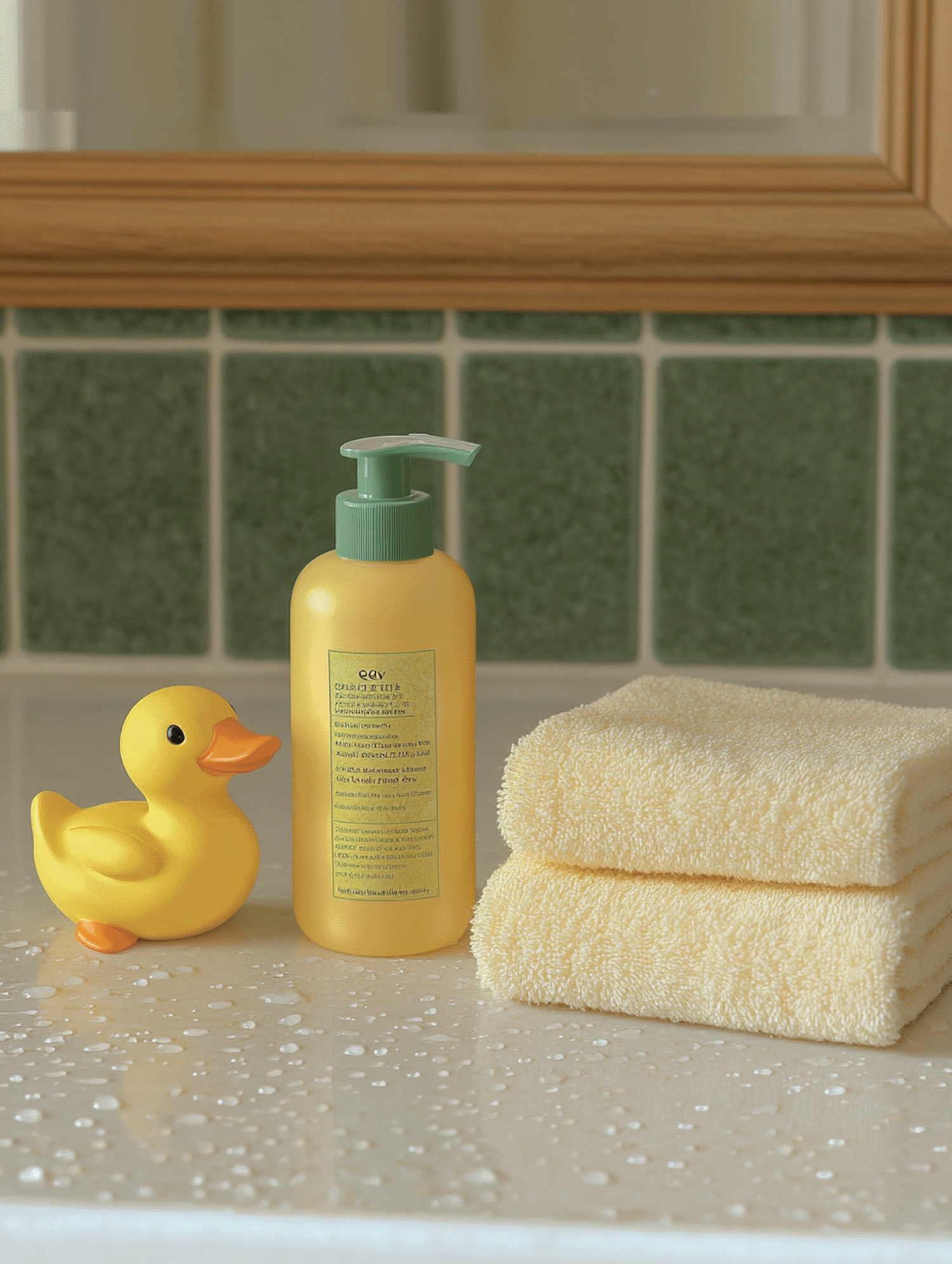 Bathroom scene with a yellow rubber duck, a yellow bottle with a green pump, and folded yellow towels on a wet countertop.