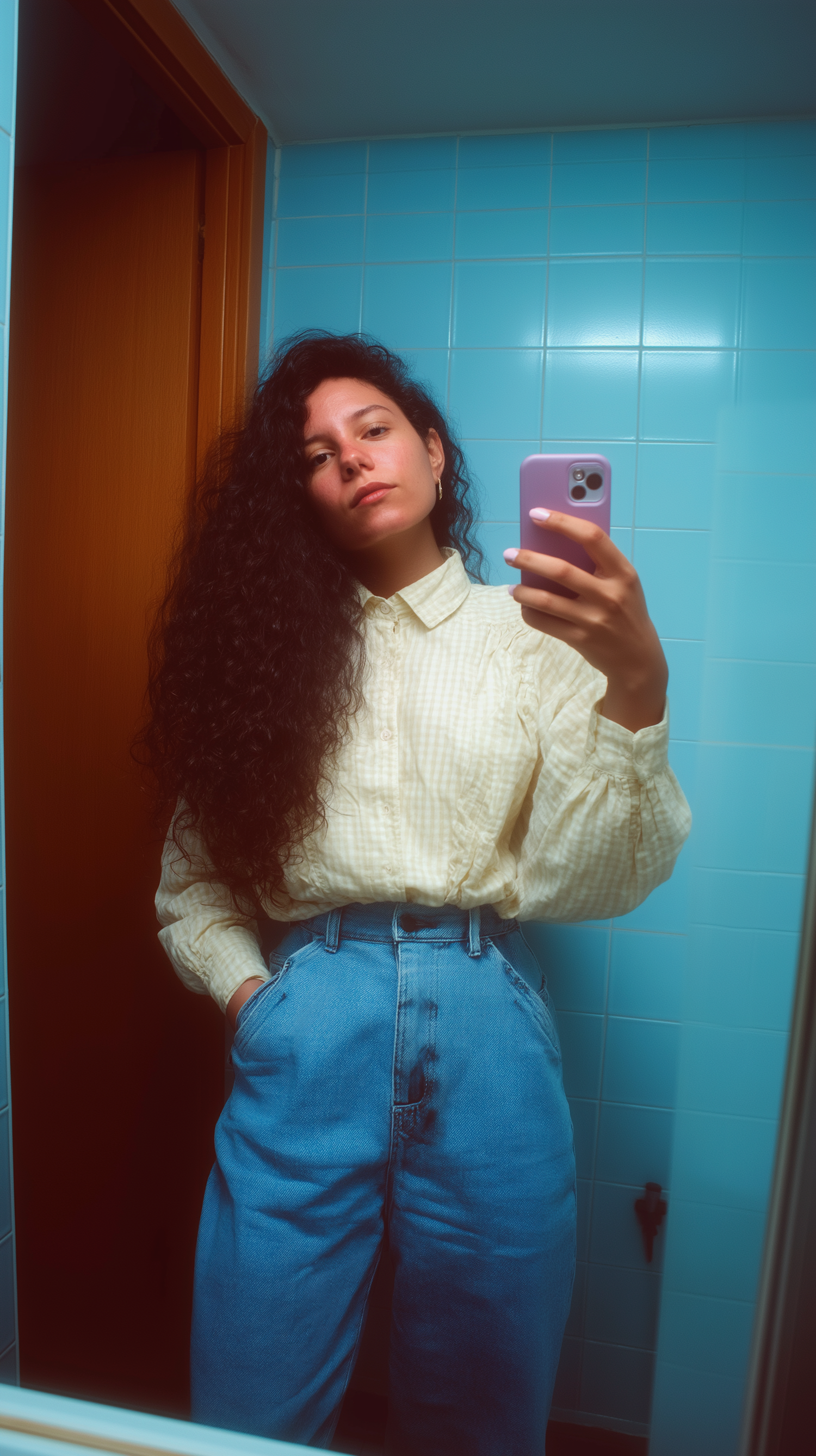 Person in a light yellow shirt and blue jeans taking a selfie in a bathroom with light blue tiles, holding a purple-cased phone.