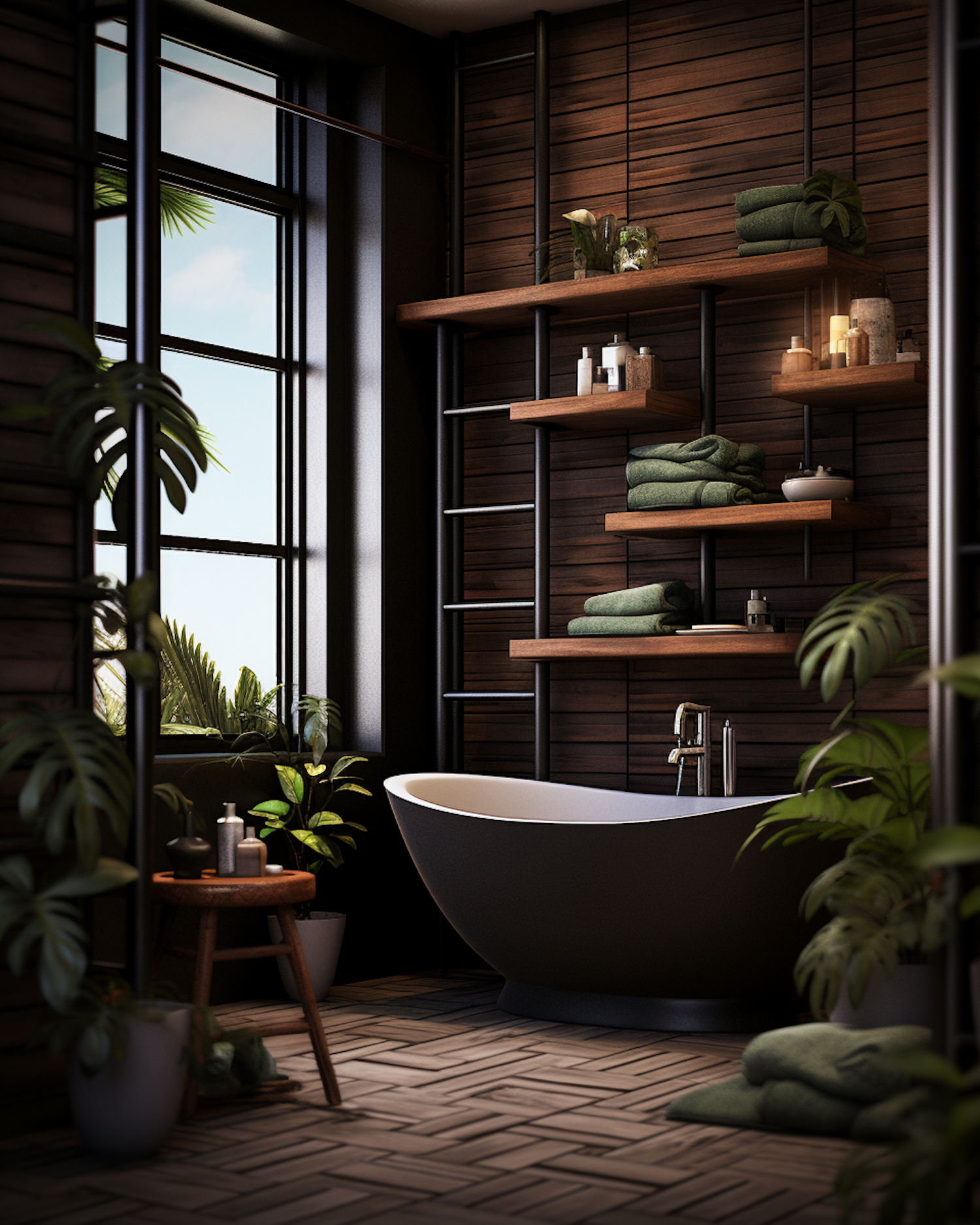 Modern bathroom with a freestanding tub, wooden shelves, green plants, and natural light for a serene, earthy ambiance.