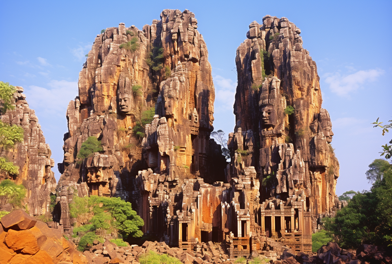 Majestic rock formations with carved faces and temple-like structures, set against a clear blue sky, evoke ancient mystery and grandeur.