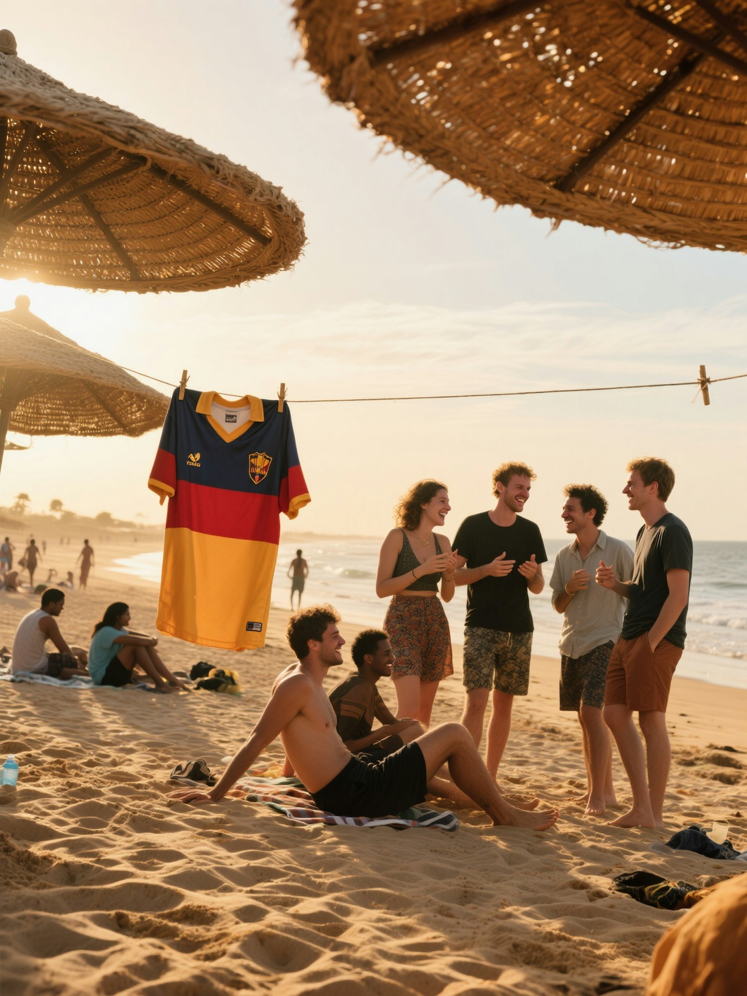 Friends enjoying a sunny beach day with a colorful jersey hanging nearby, under straw umbrellas and a golden sunset.