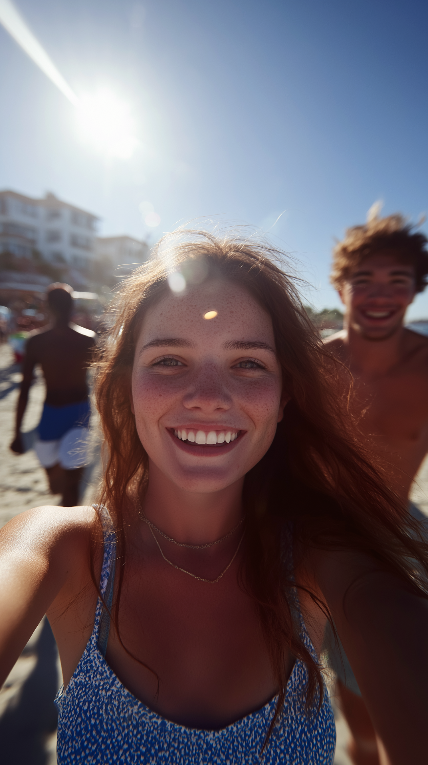 A cheerful young woman takes a selfie on a sunny beach, with friends and a vibrant background adding to the lively atmosphere.