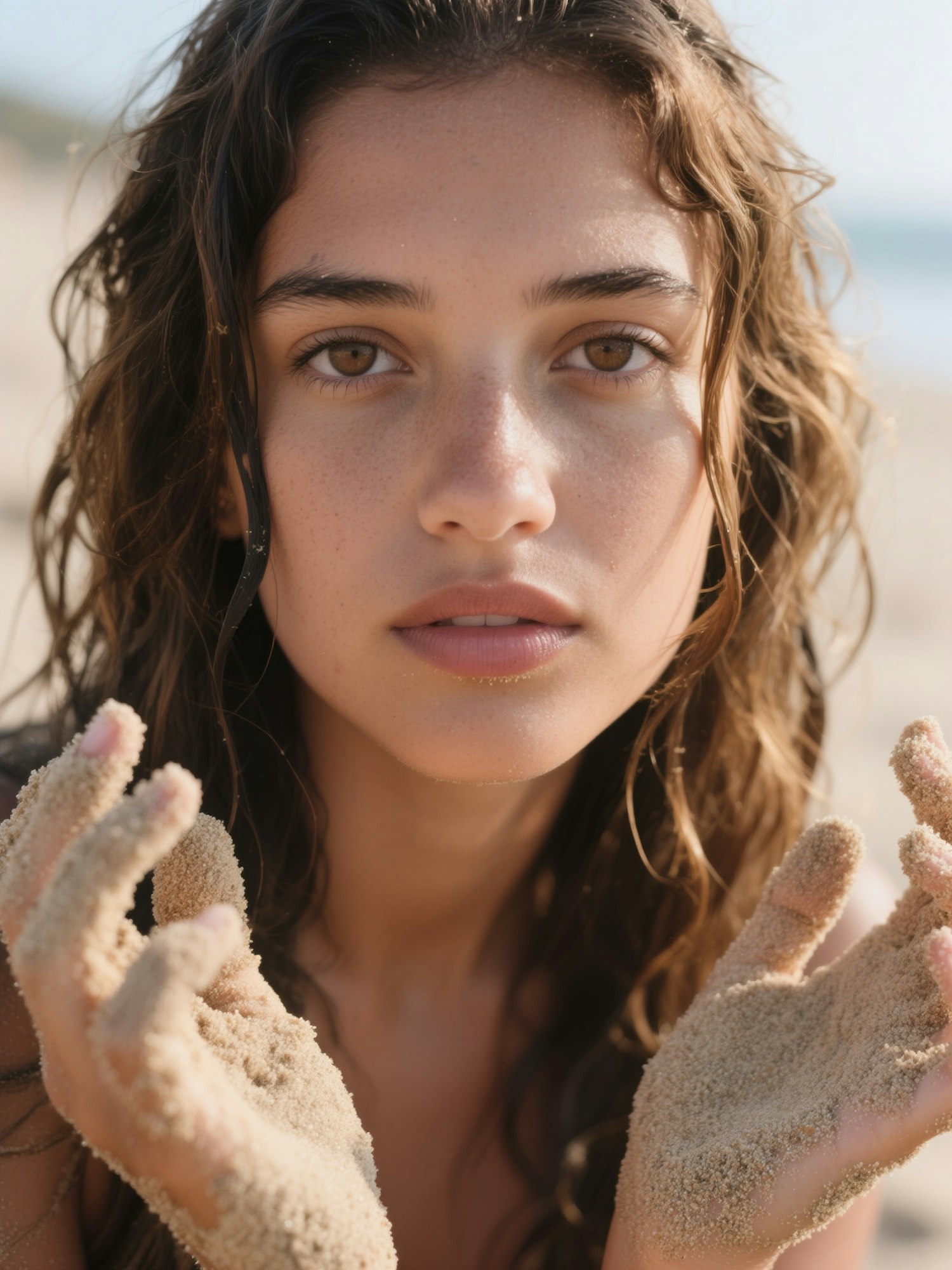 Soft natural light, muted faded colors, desaturated tones, light and airy palette, visible film grain, cinematic composition, candid imperfect capture, off-center framing, artistic angles, lifestyle photography, dreamy atmosphere, high resolution, realistic textures, slight blur or motion imperfections, soulful timeless aesthetic — close-up portrait of a sun-kissed young woman with olive skin, wavy dark blonde hair wet and falling naturally around her face, sand clinging to her hands and cheeks, eyes gazing softly into the lens, background softly blurred into pale beach tones