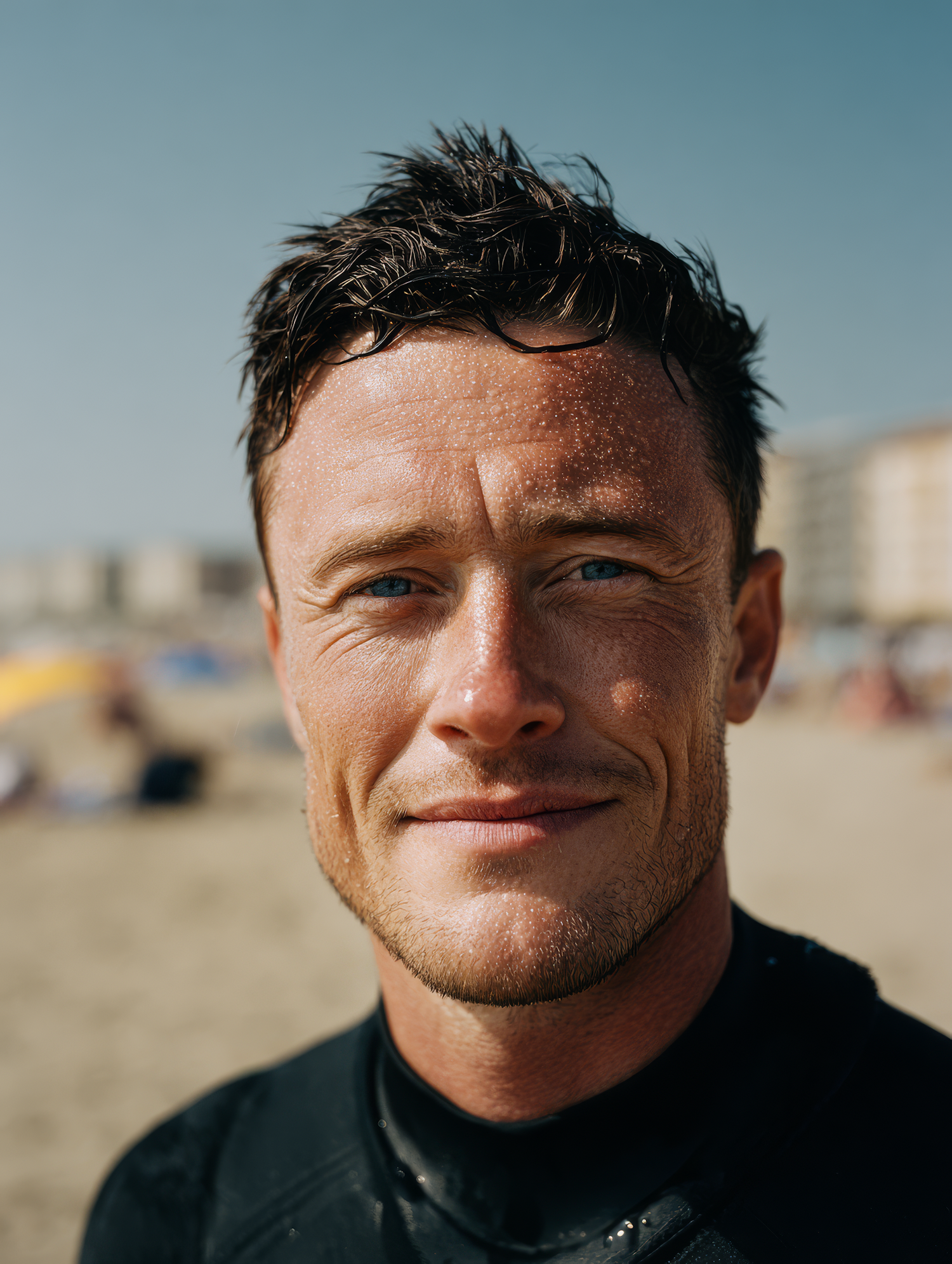 Close-up of a man in a wetsuit on a sunny beach, with wet hair and a slight smile, capturing a relaxed and natural moment.