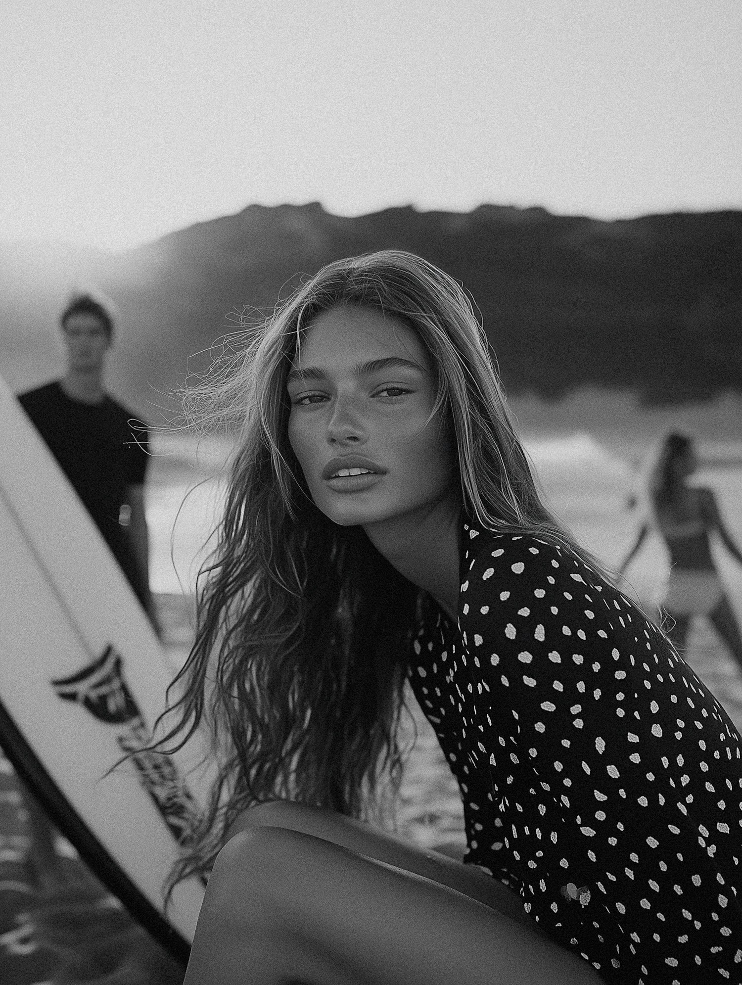 Black-and-white beach portrait of a woman in a polka-dot top, with surfboards and a scenic backdrop of waves and mountains.