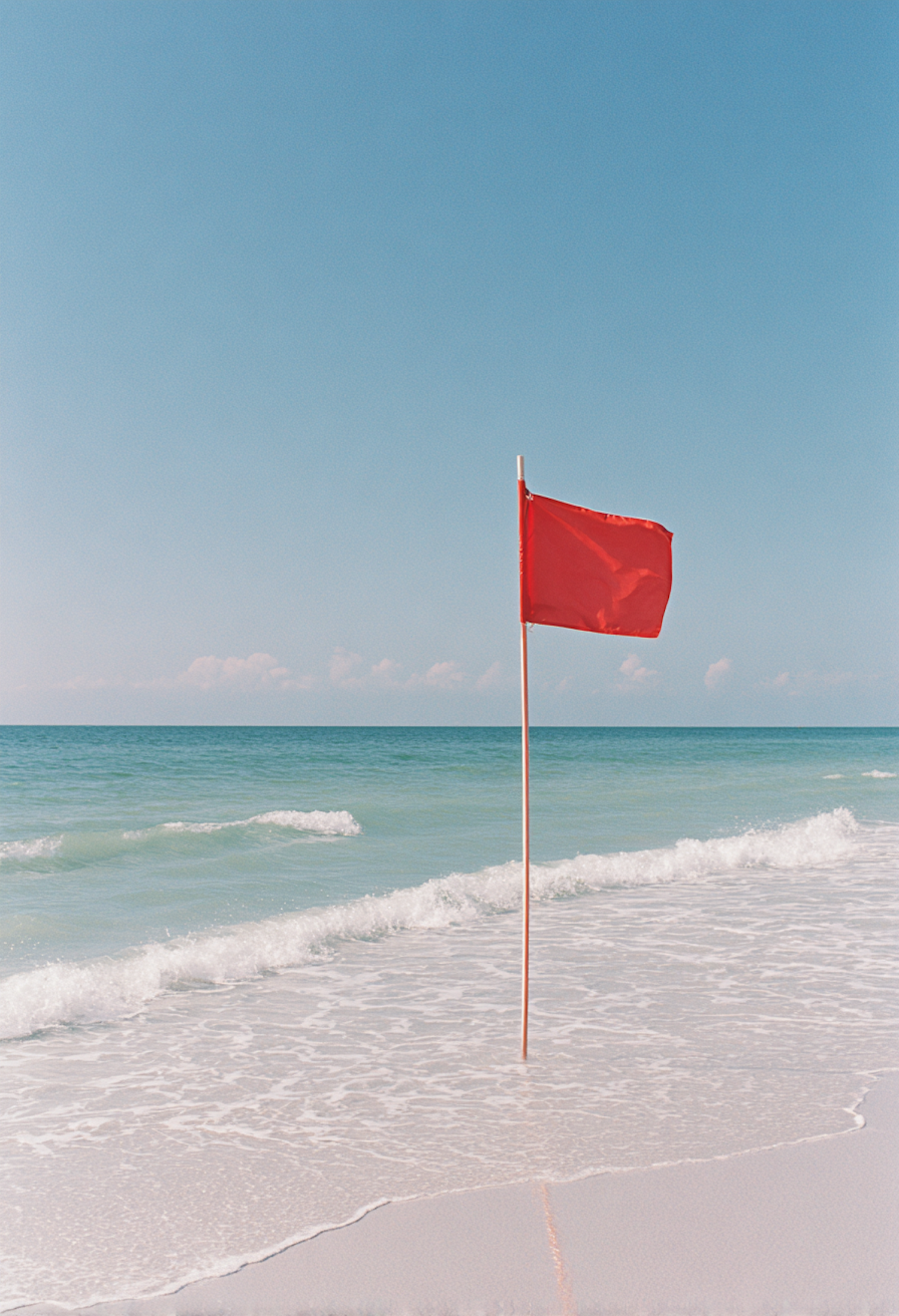 Bright red warning flag stands on a calm, clear beach with gentle ocean waves, framed by vivid blue skies.