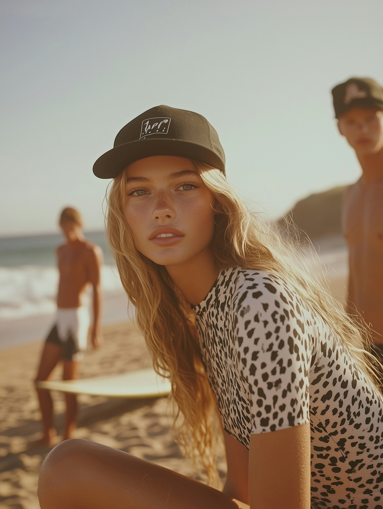 A blonde woman in a spotted top and cap poses on a sunny beach, with two men in the background near the ocean waves.