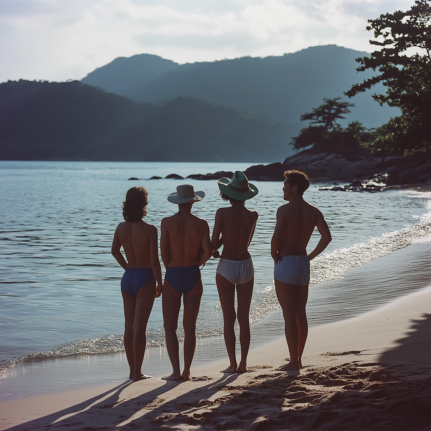 Four people in swimwear stand on a beach, facing the ocean with mountains in the background, under a partly cloudy sky.