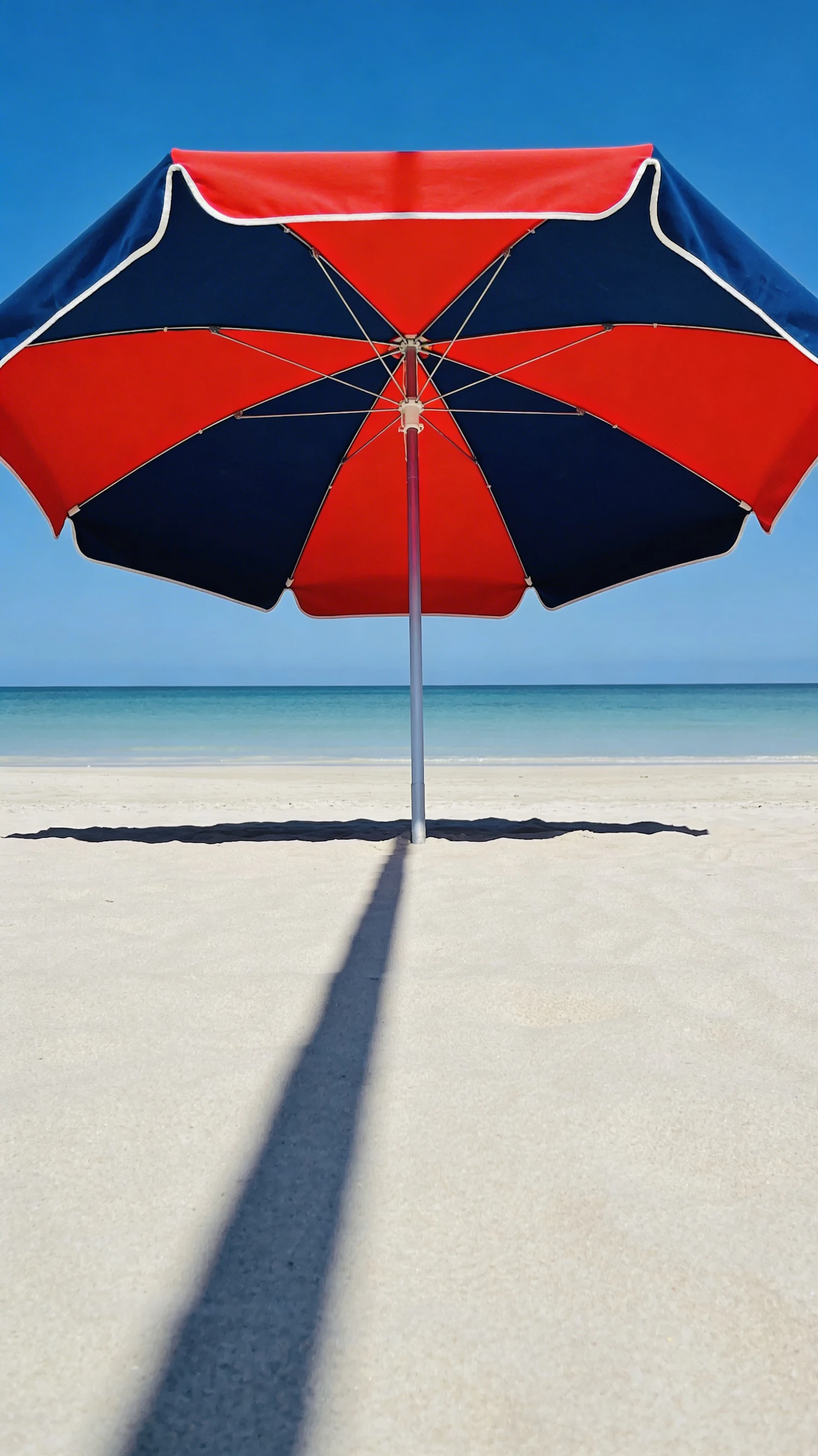 A colorful beach umbrella on white sand with a clear blue sky and calm ocean in the background, evoking a serene summer vibe.