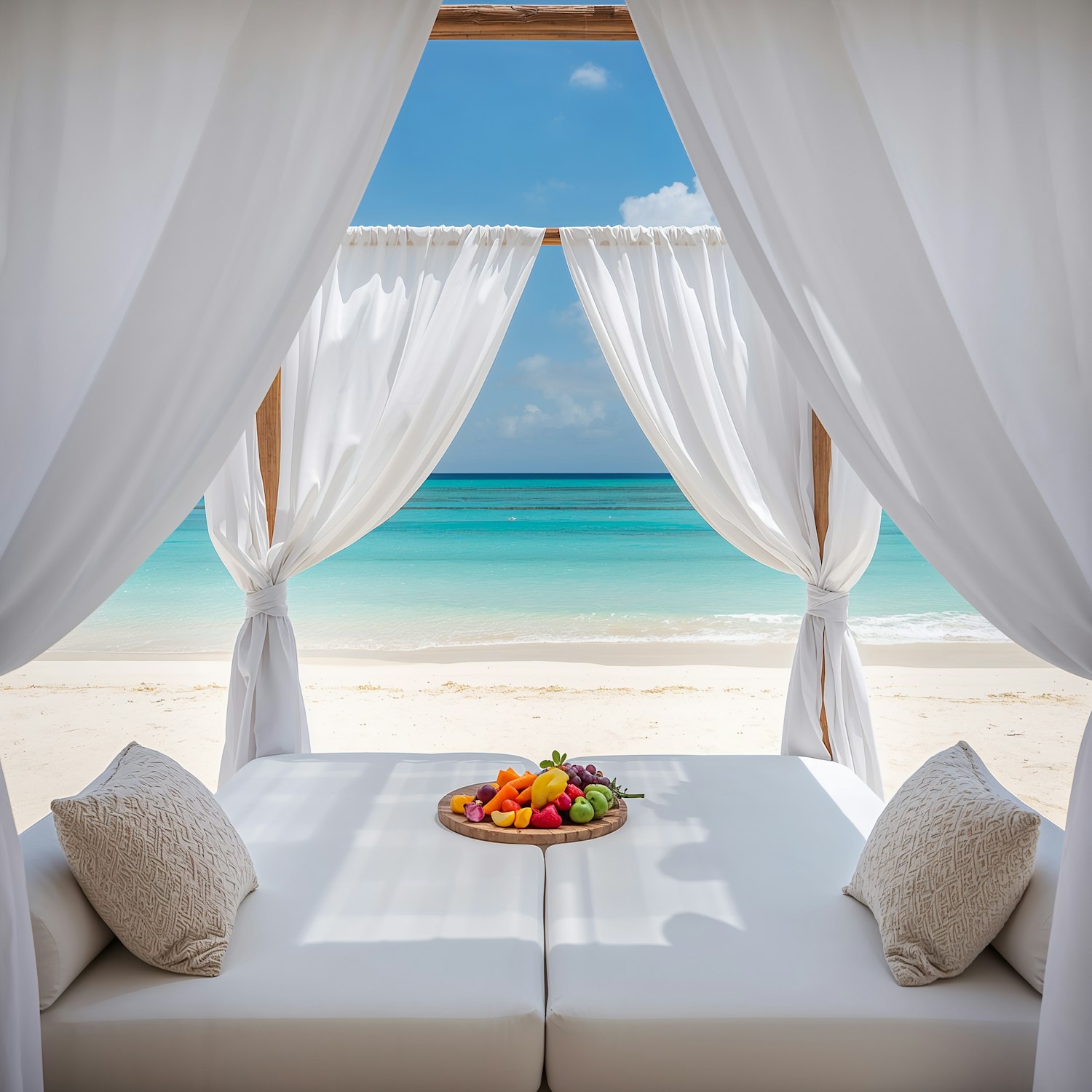 Luxurious beach cabana with white curtains, a cozy mattress, and a tray of fresh fruits, overlooking turquoise waters and a sunny sky.