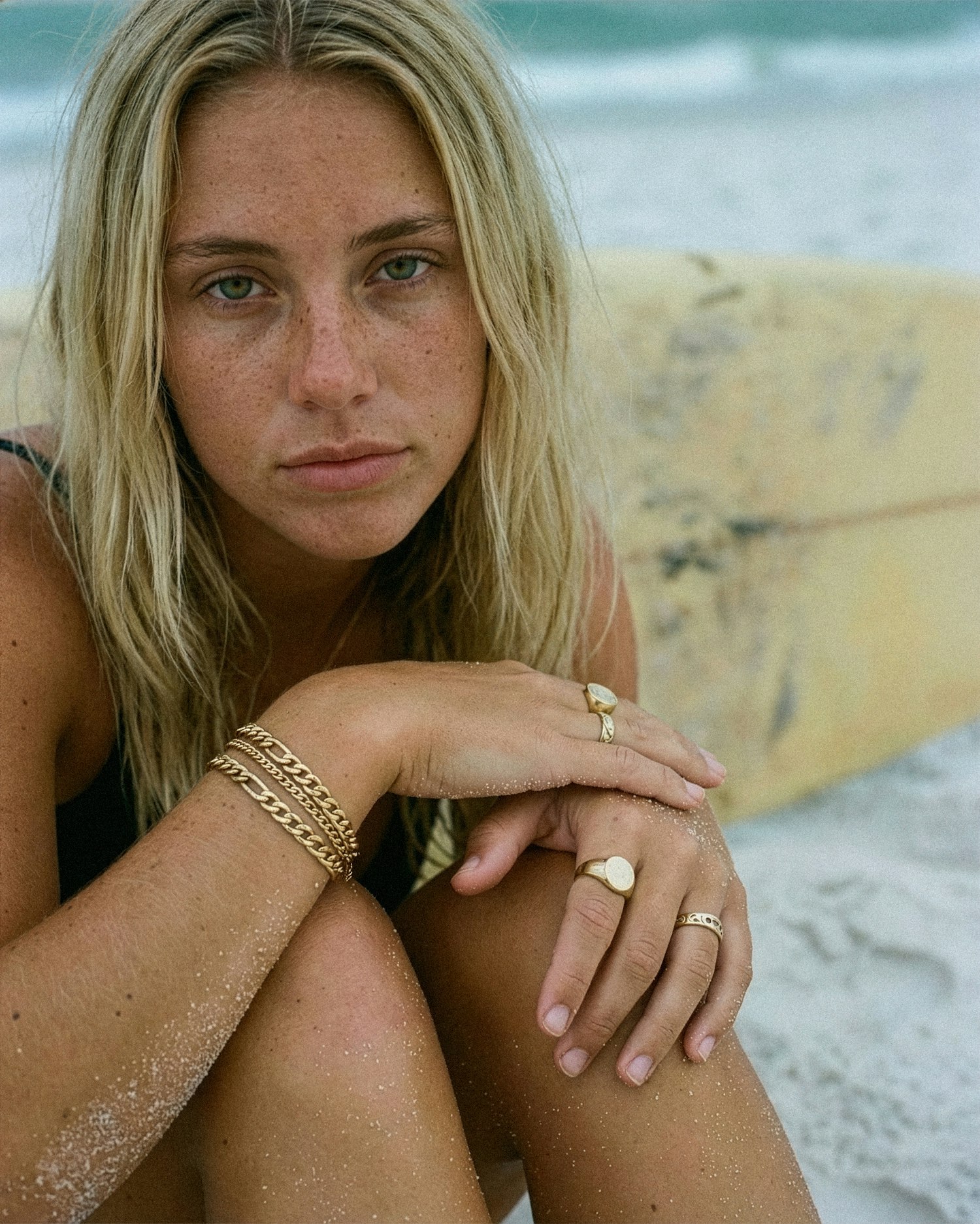 A young woman with blonde hair and gold jewelry sits on a sandy beach with a surfboard in the background, evoking a serene coastal vibe.